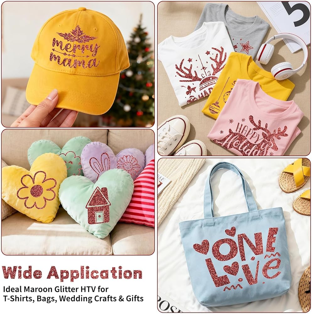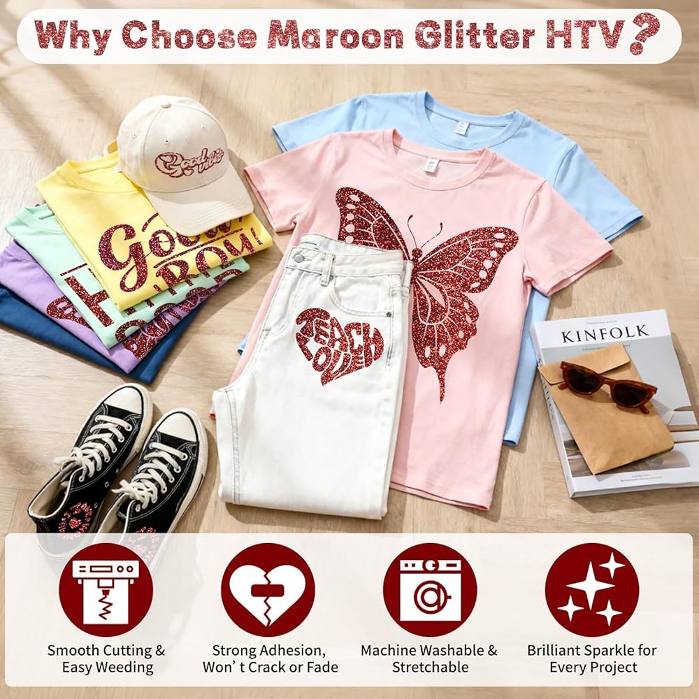 TECKWRAP Maroon Glitter HTV Heat Transfer Vinyl Roll 10" x10FT Iron On Vinyl for T Shirts DIY Crafts Sparkly Glitter HTV Vinyl Heat Transfer Includes Glitter Pin Pen