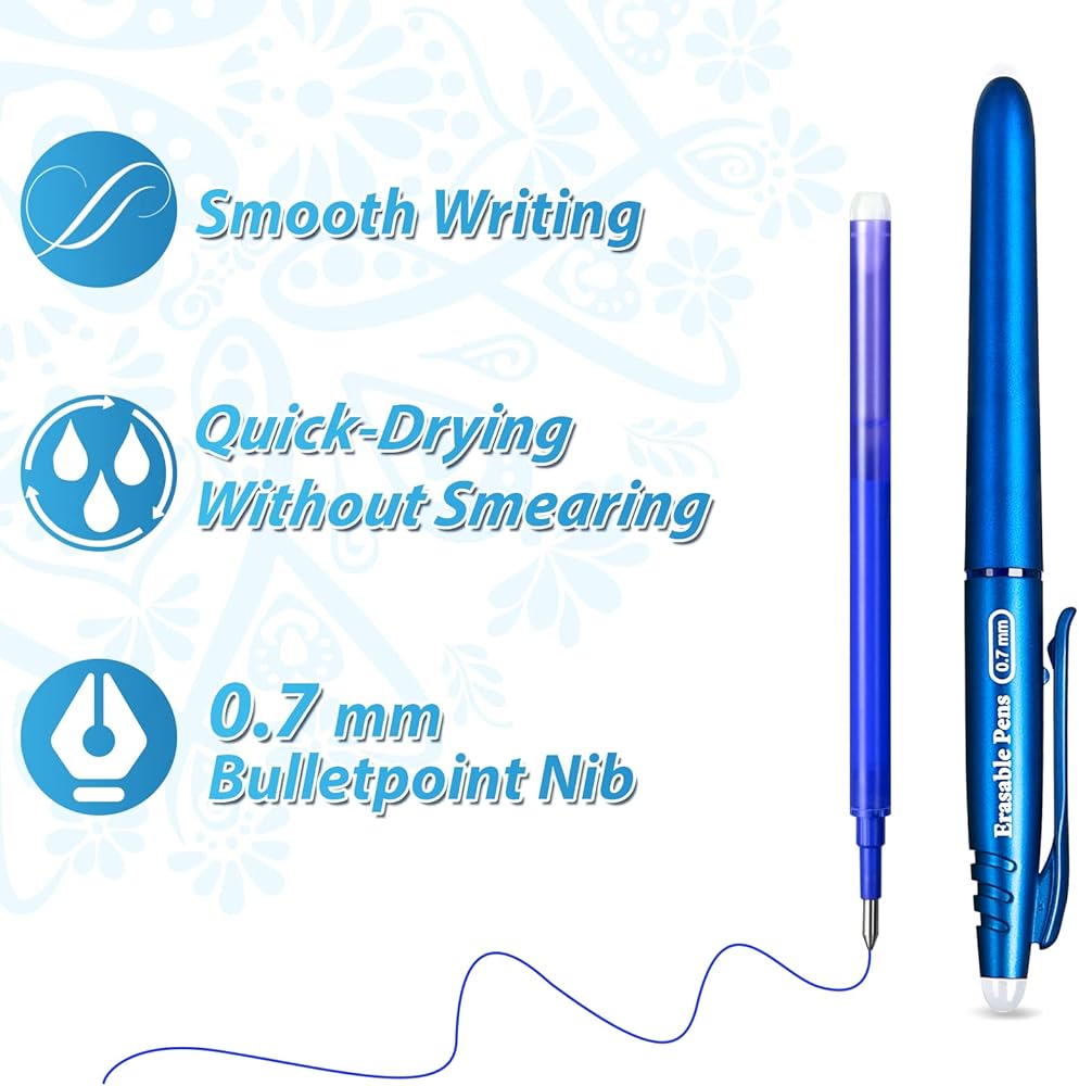 【Blue Erasable Pens for Puzzles 】 We play Sudoku crossword puzzles with the kids on the weekends, and these pens work much better than pencils. The blue ink is bright and eye-catching, much easier to see than the light grey of a pencil, and doesn't leave annoying eraser shavings and fuzzy erasure marks. Erasable pens clicker are more vibrant and provide a cleaner, sharper image in crossword puzzles and allow for simple corrections without messing up