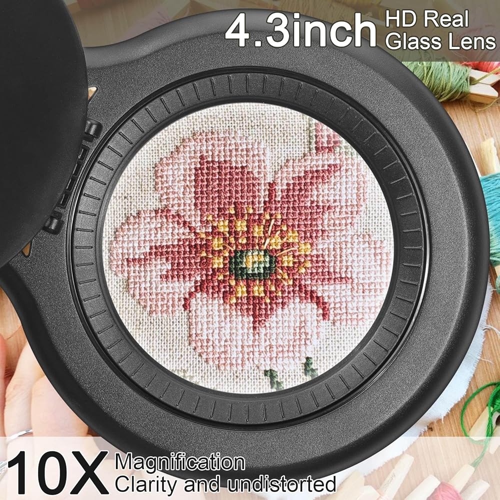 10X HD Magnification: Tomsoo magnifying glass with light and stand provides 15 diopters and a 4.3-inch real glass lens, so it's more straightforward than plastic lenses and won't distort your view. Perfect for reading newspapers and books, sewing, drawing, cross-stitching, crocheting, or other crafts and hobbies.