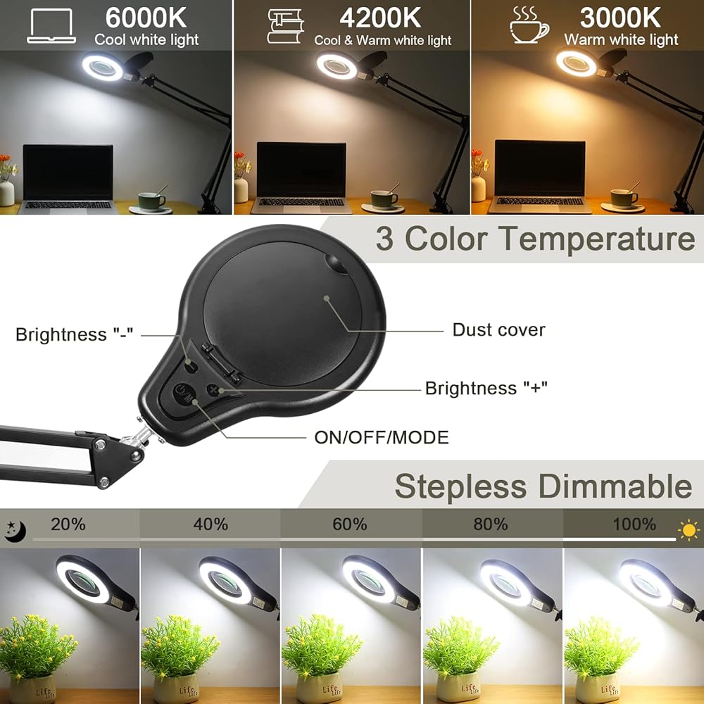 3 Color Modes Adjustable: This lighted magnifying glass with clamp has 3 color temperatures and 10 levels brightness, you can easily touch the button to adjust the lighting modes and brightness to match your environment, avoid eye strain. It's an excellent solution for the visually impaired or those who suffer from macular degeneration.
