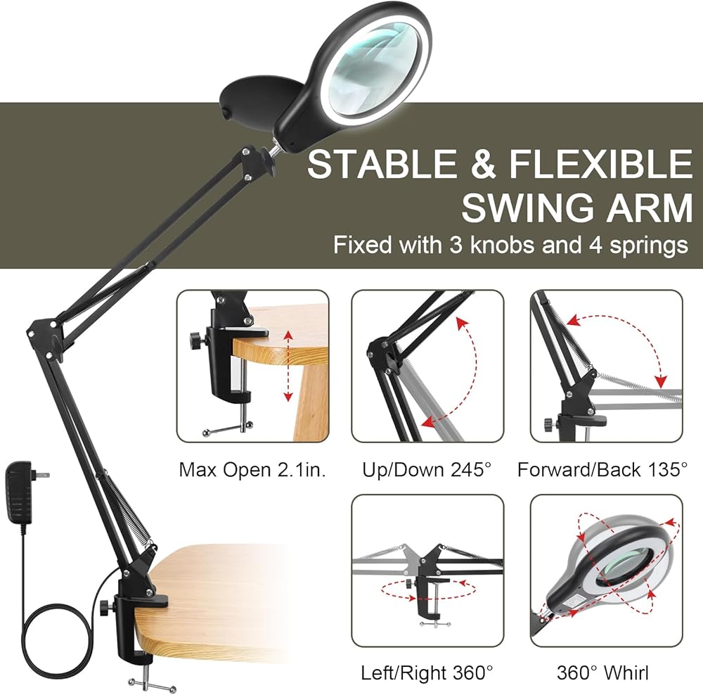 Flexible Swing Arm: The metal body has 4 powerful springs and 3 knobs that can keep the arm and the light source stable at any angle. LED magnifying lamp comes with a sturdy metal clamp, and the max clamping distance is 2.1 inches. You can easily manually attach it to the flat desktop edge, widely used at desks, tables, workbenches, shelves, etc.