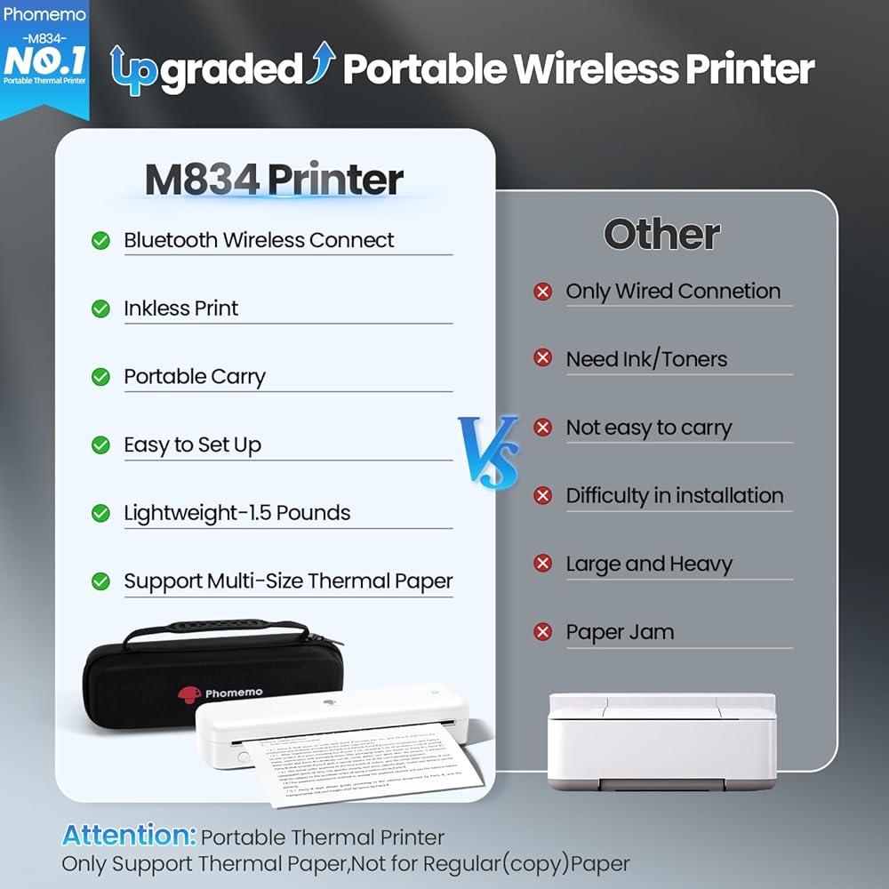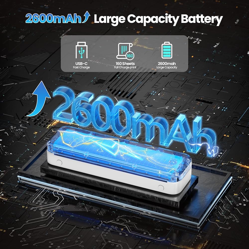 Extended Battery Life: M834 wireless portable travel printer equipped with a 2600mAh rechargeable battery, the Phomemo M834 printer boasts 116% more capacity than other thermal portable printer, allowing for over 160 pages of continuous printing without power worries.