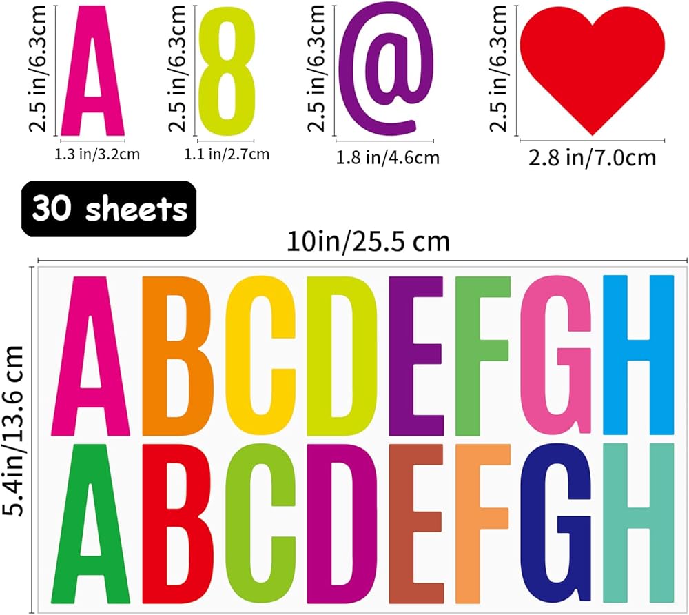 Size: each sheet is approx. 10 x 5.35inch/ 25.5 x 13.6cm,each capital letter, numeric symbol measures approx. 2.5 inch/ 6.35 cm in height, proper size and cute appearance make your to stick to anywhere you want