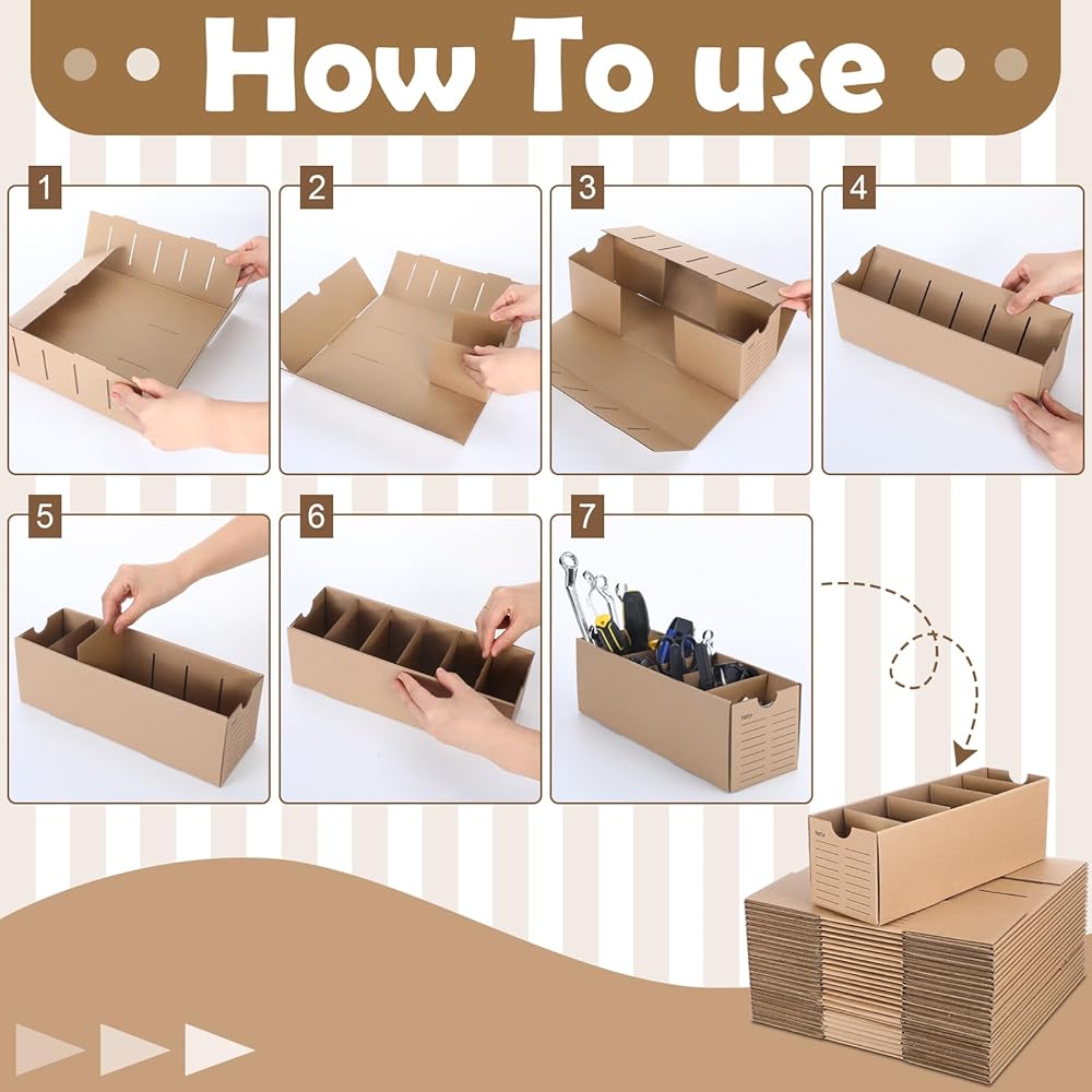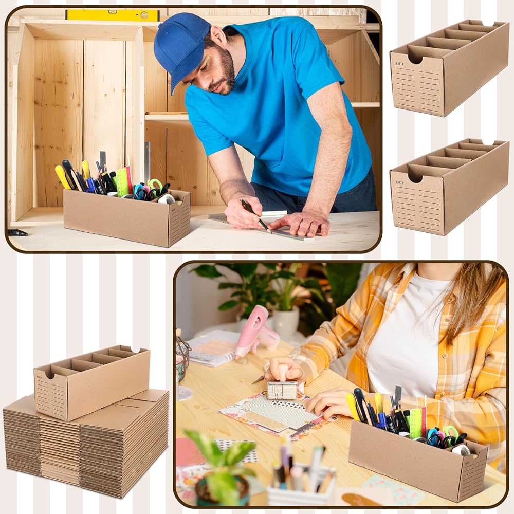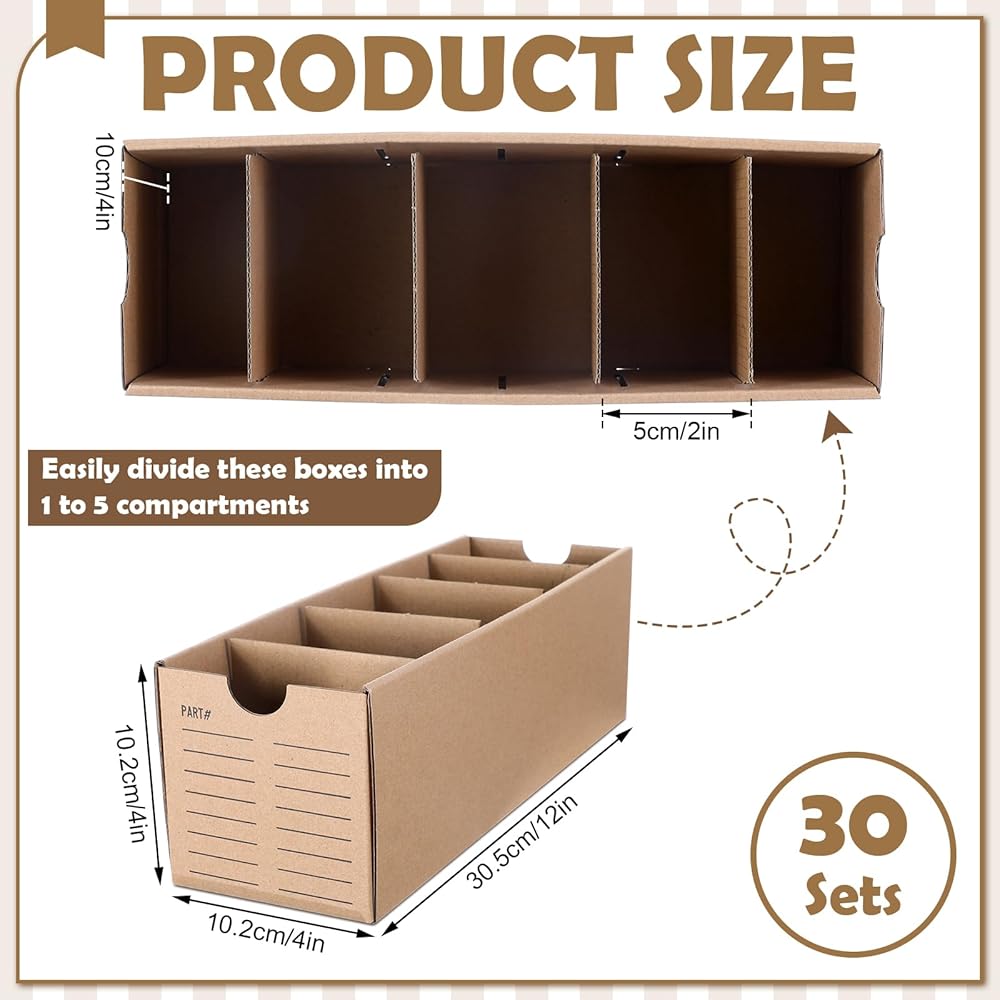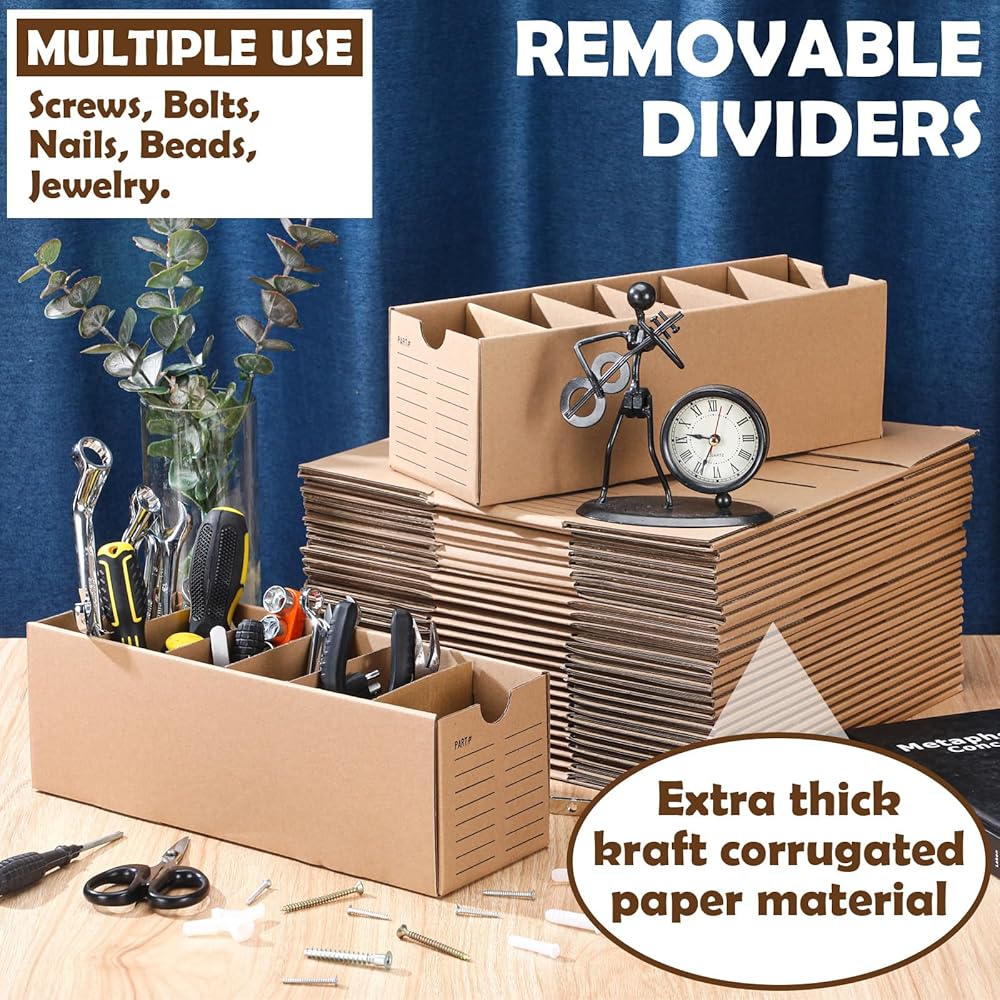 Practical Compartments: easily divide these cardboard parts boxes into 1 to 5 compartments, depending on your storage needs; Each box includes four partitions that fit neatly into pre-cut slots; This practical feature allows you to optimize space