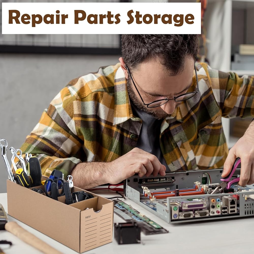 Sturdy and Durable Construction: made of robust corrugated cardboard, these cardboard storage bins are designed to secure a variety of parts; Their durability makes these boxes a cornerstone of any inventory management system, supporting the safe and neat storage of items