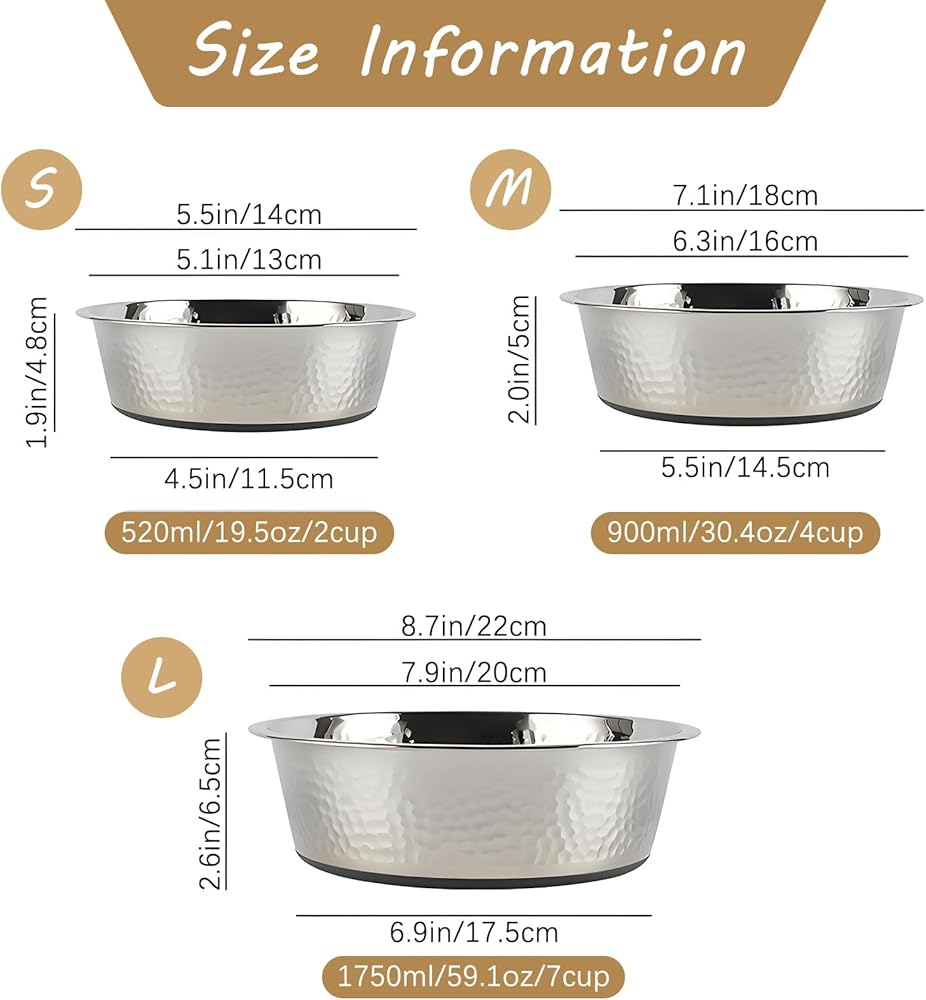 Size : Metal pet food bowls are available in three different sizes. 6.9*5.5*2.2 inch, 8.7*6.7*2.8 inch, 10.0*3.1*8.1 inch.Choose the right size bowl for your pet, suitable for puppies, medium, large and extra large dogs, cats and other animals