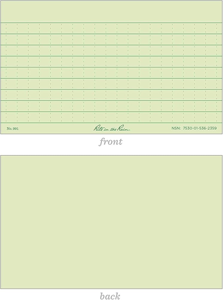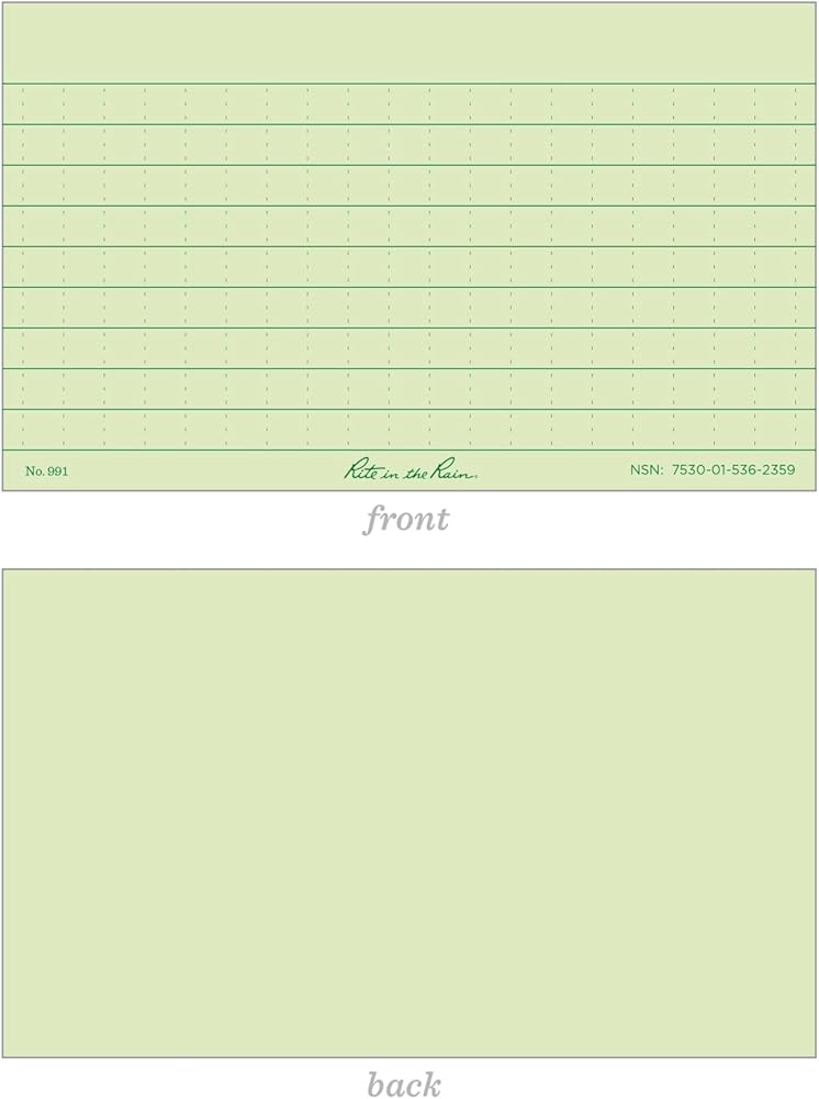 Rite in the Rain index cards are the perfect solution for any kind of mess job. Made with 100# Rite in the Rain tag board, these 3" x 5" cards are tough enough to last through any mission and small enough to be carried along in any pocket. Universal pattern on the front, blank on the back. Sold in packs of 100.