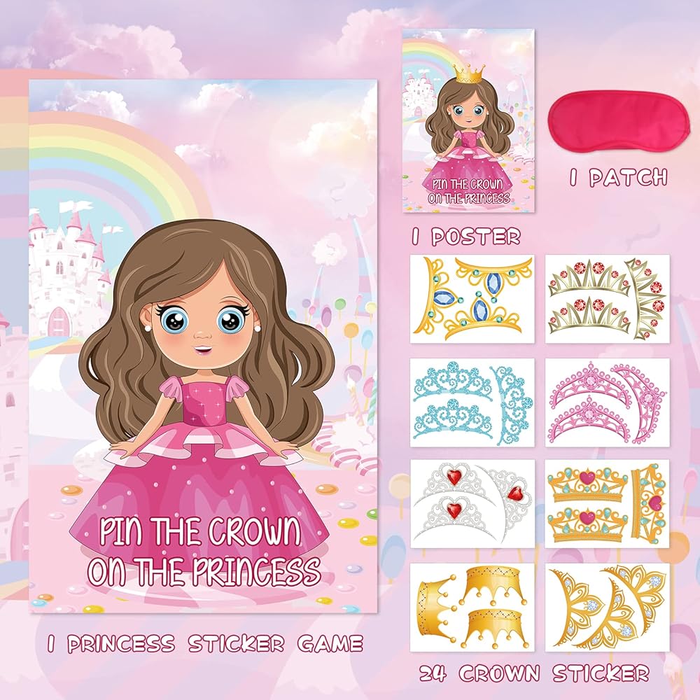 Package List: Pin the games for kids package includes 1 large princess poster, 24 princess crown stickers, and 2 eye masks. A complete game set of accessories must be worth every penny