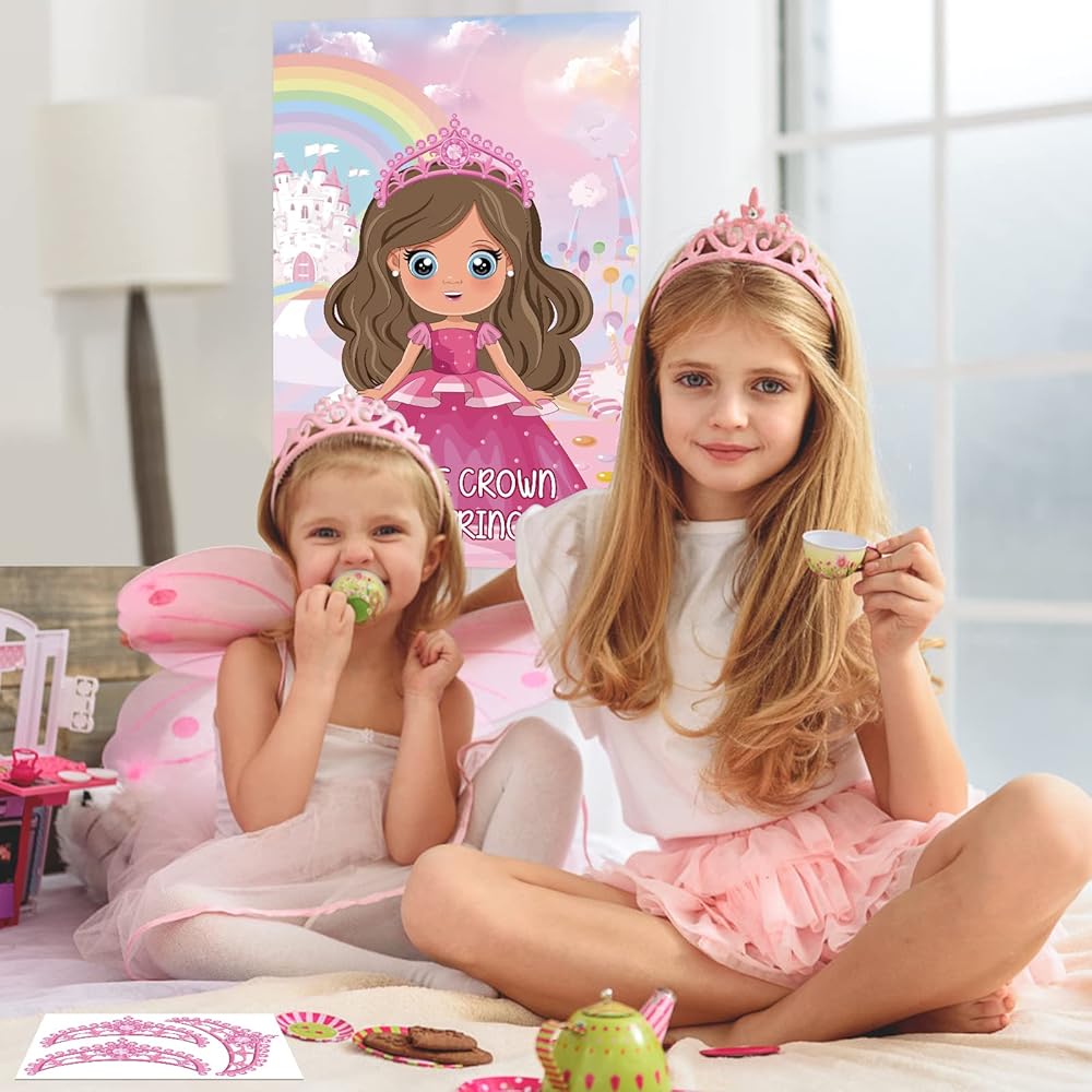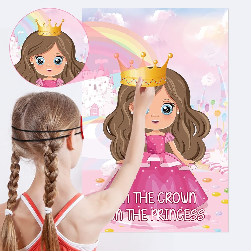 Princess Party Games: First, put the poster on the wall, then everyone can write their name on the crown, then the player brings blindfold mask, put the crown on the poster, whoever gets closest wins!!! It's a fun games!
