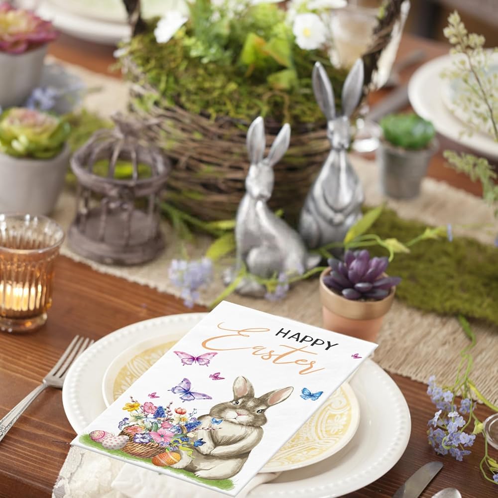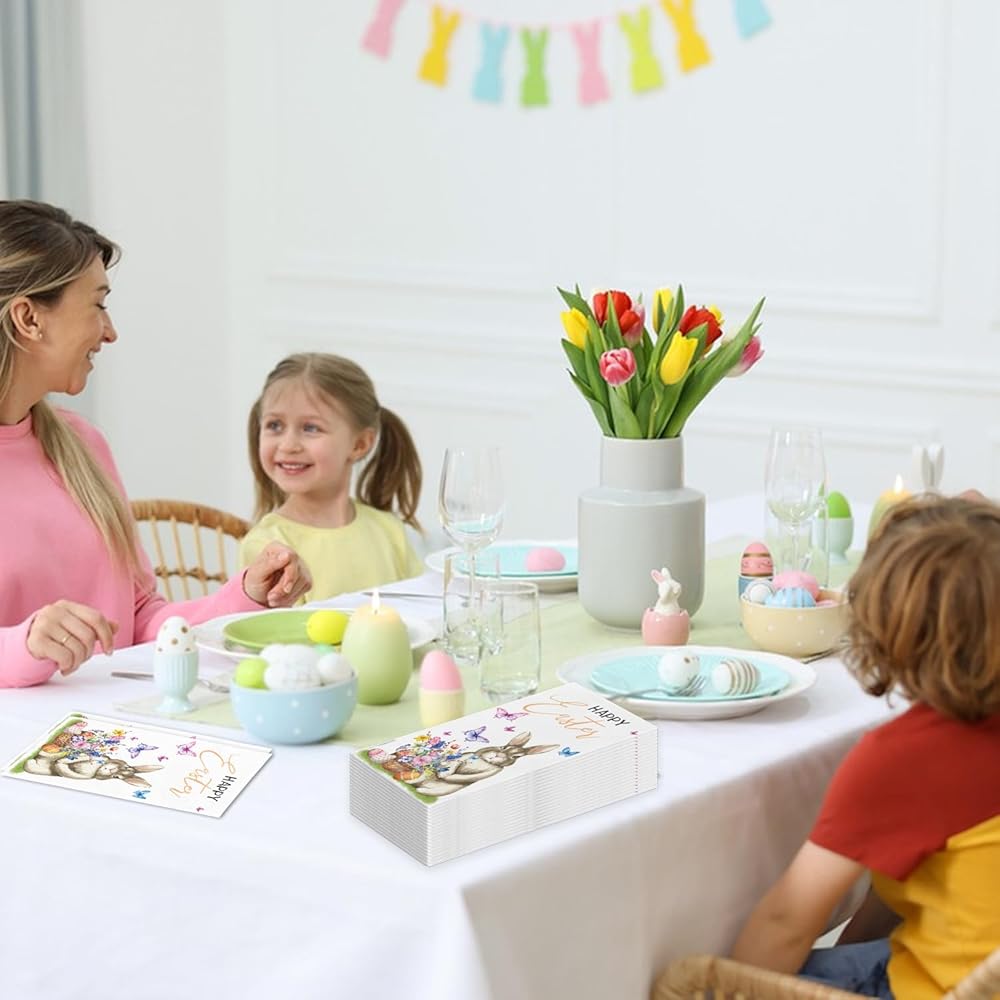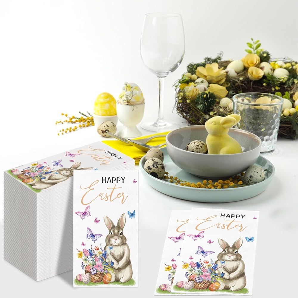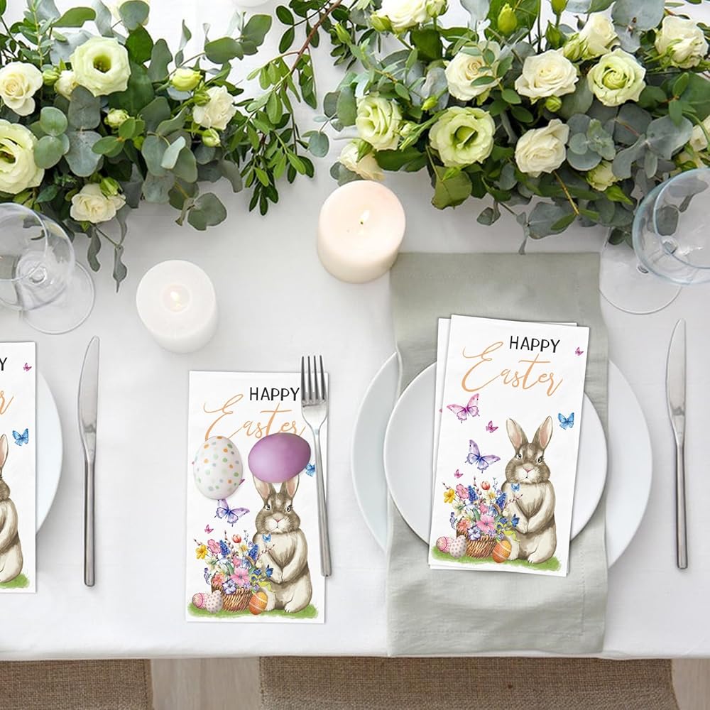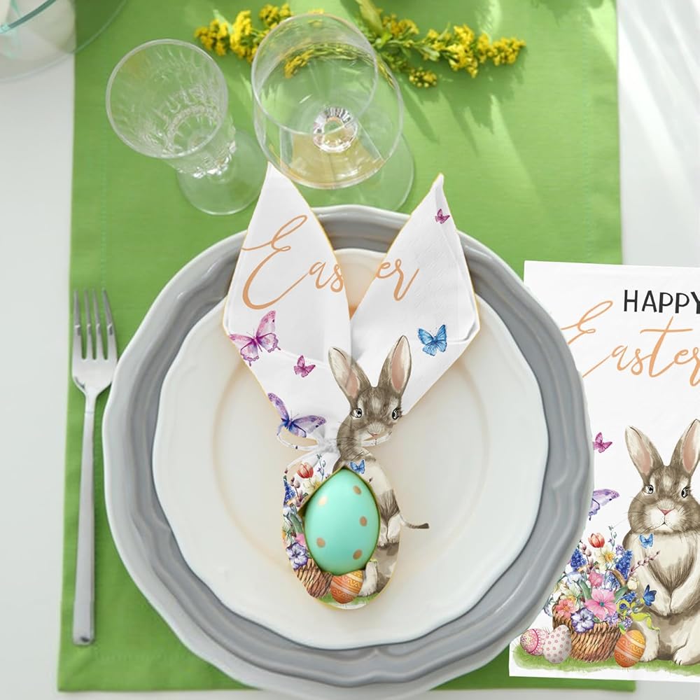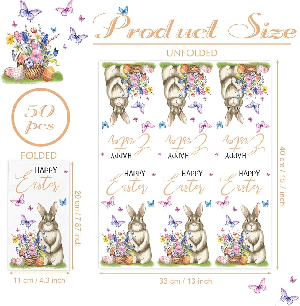 PREMIUM MATERIAL: Made from premium safety paper, these Easter dinner paper napkins are soft to the touch yet strong and absorbent. They are perfect for quickly drying hands or wiping away spills, while the beautiful design remains intact throughout use. You won't have to worry about the pattern fading or coming off easily