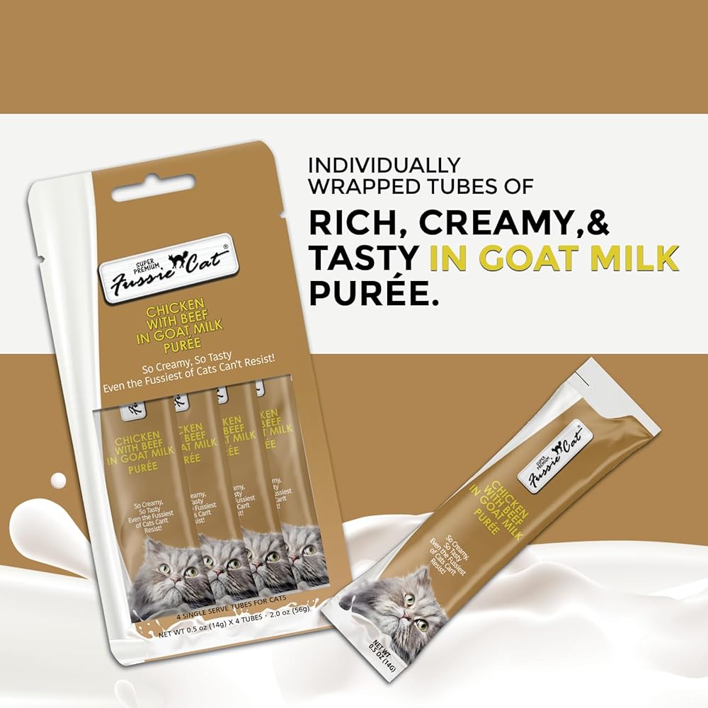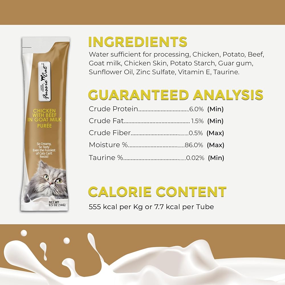The Chicken Duck in Goat Milk Puree is an exquisite creation, featuring succulent chicken and rich duck enveloped in velvety goat milk gravy - pureed to palatable perfection. This luxurious blend is specially crafted for cats with a taste for the finer things, offering a unique flavor profile that's sure to entice.