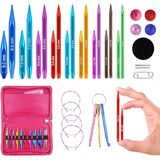 【Interchangeable Circular Knitting Needle Set】 Package included:13 pairs 4 inches interchangeable knitting needles:3.0mm,3.25mm,3.5mm,3.75mm,4.0mm,4.5mm,5.0mm,5.5mm,6.0mm,7.0mm,8.0mm,9.0mm,10.0mm.And 4 universal swivel cables,2 cable connectors,2 retaining keys,4 end caps,1 non-slip pad,20 stitch markers and 1 blue leather bag.Every knitting needles is engraved with clear size.This full size interchangeable aluminum circular knitting needles set can meet your various needs