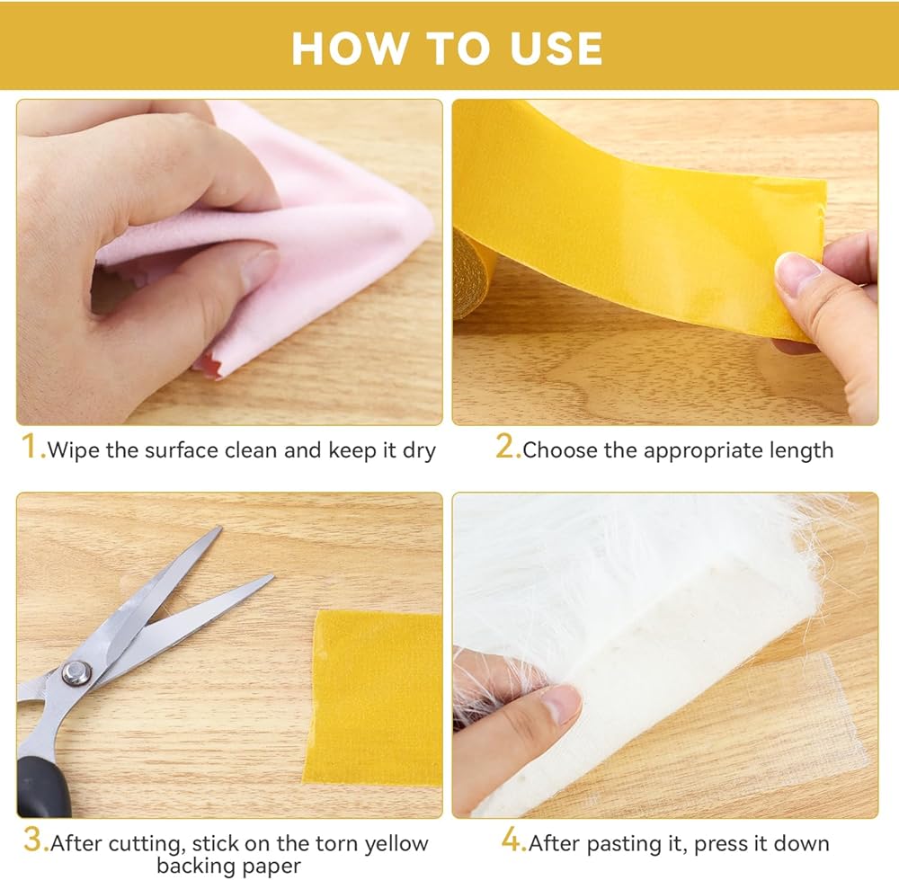 Clean the material surface and keep it dry, Cut the right size you need, tear the yellow backing paper, stick the tape onto the object.