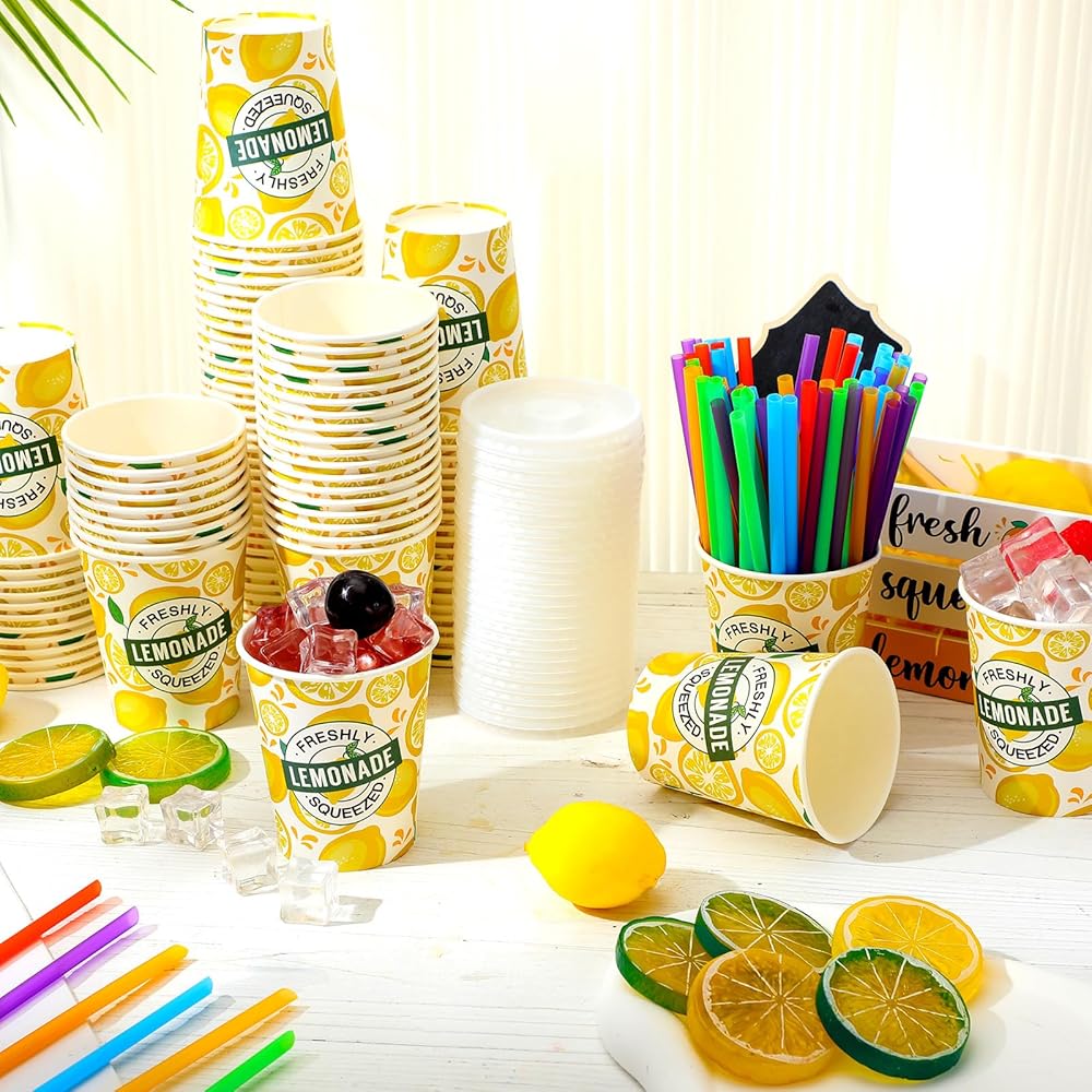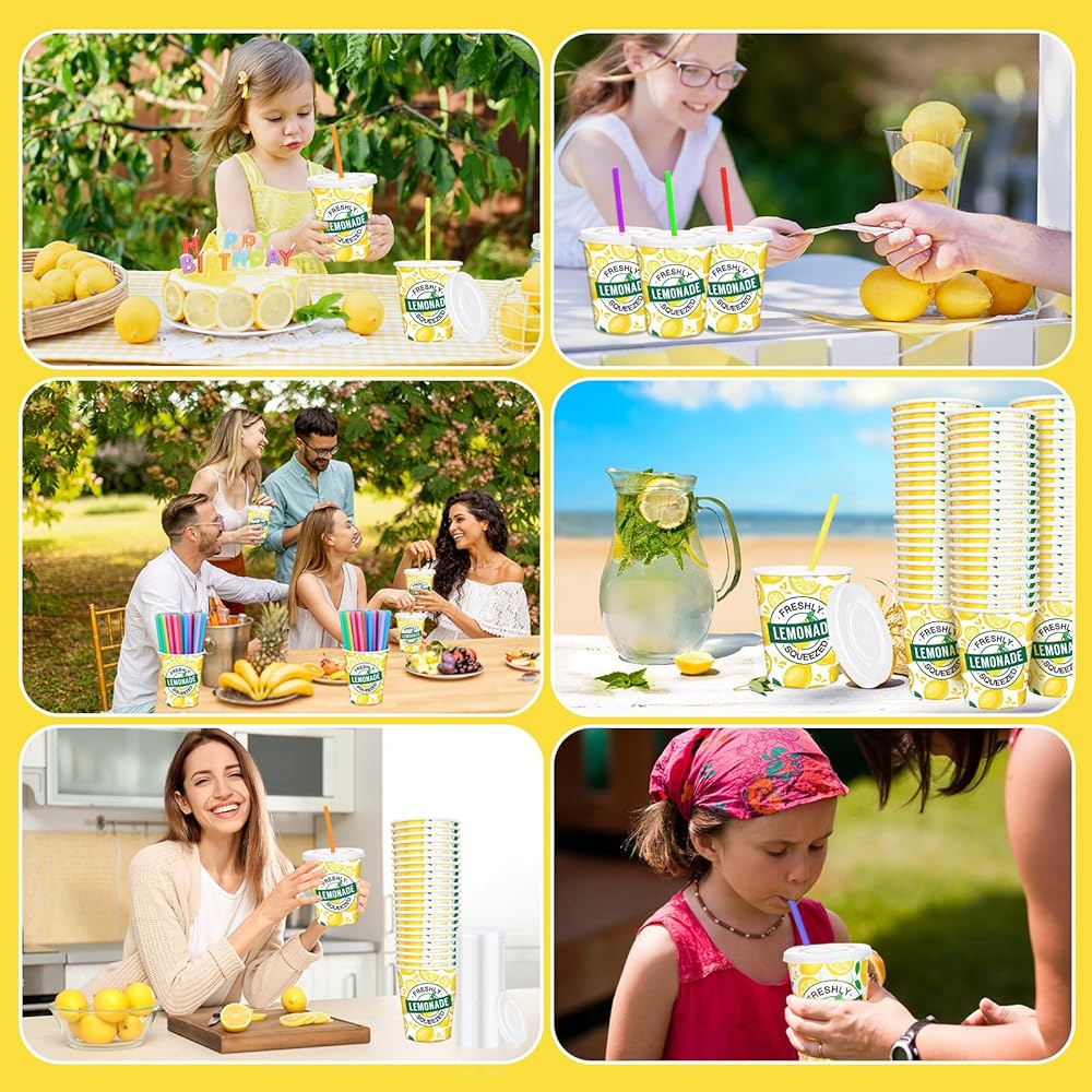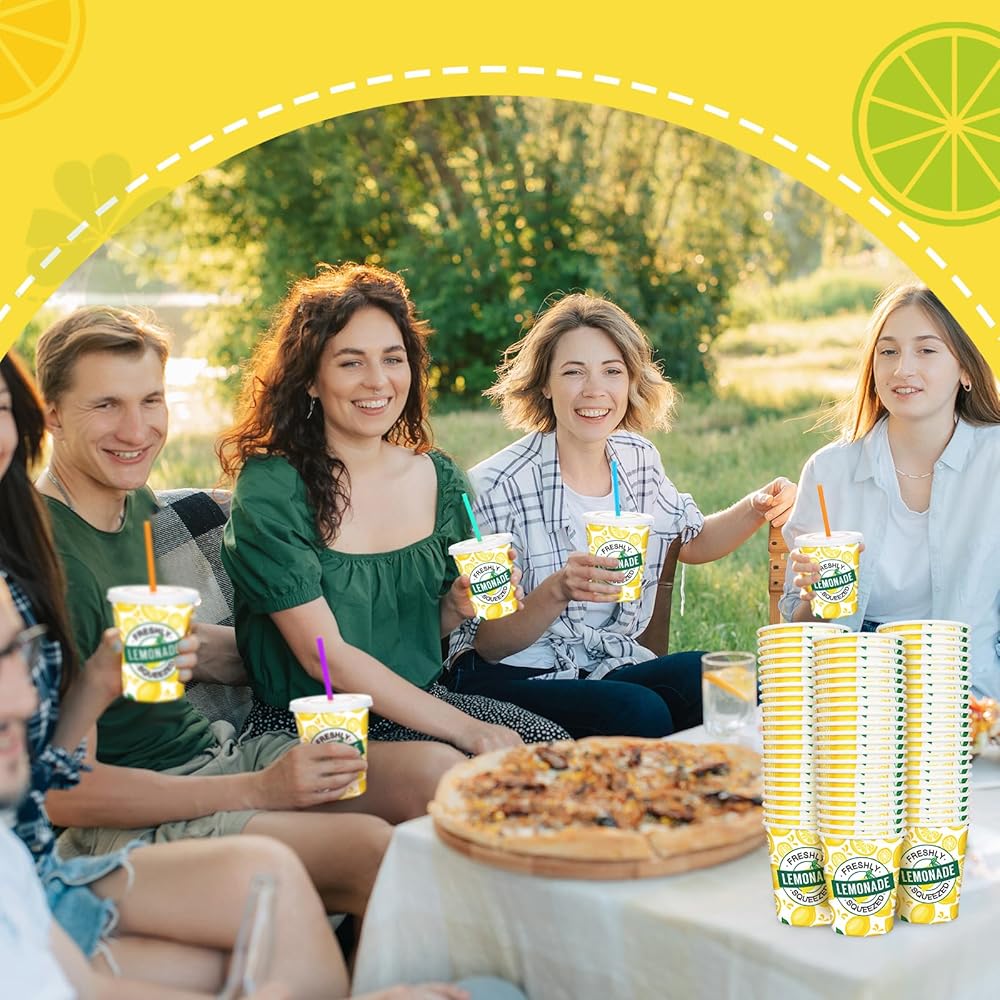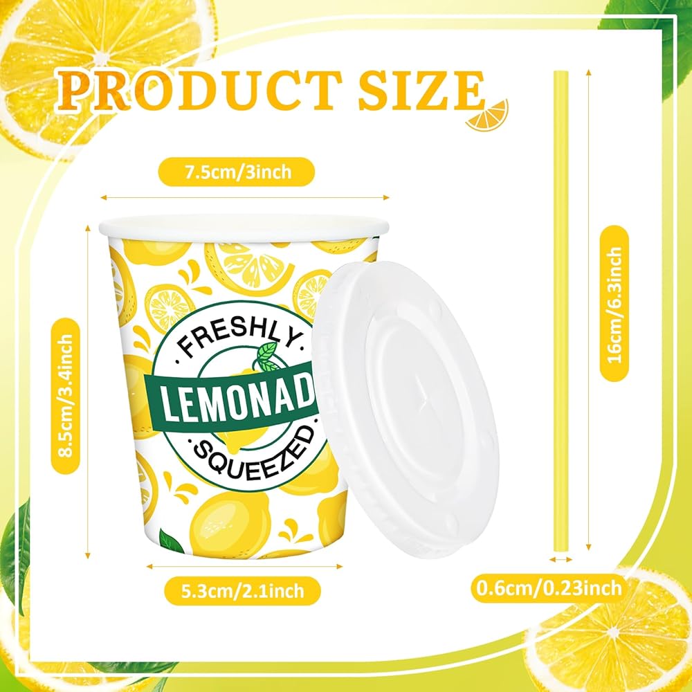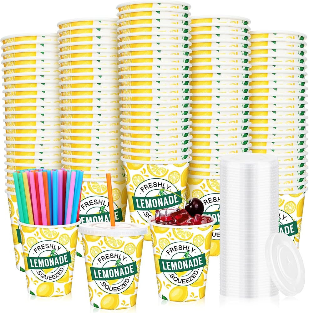 Lemonade party decorations: the package comes with 100 paper lemonade cups, 100 straws and 100 lids; Ample quantities can satisfy your daily or summer party demands, which are nice party additions