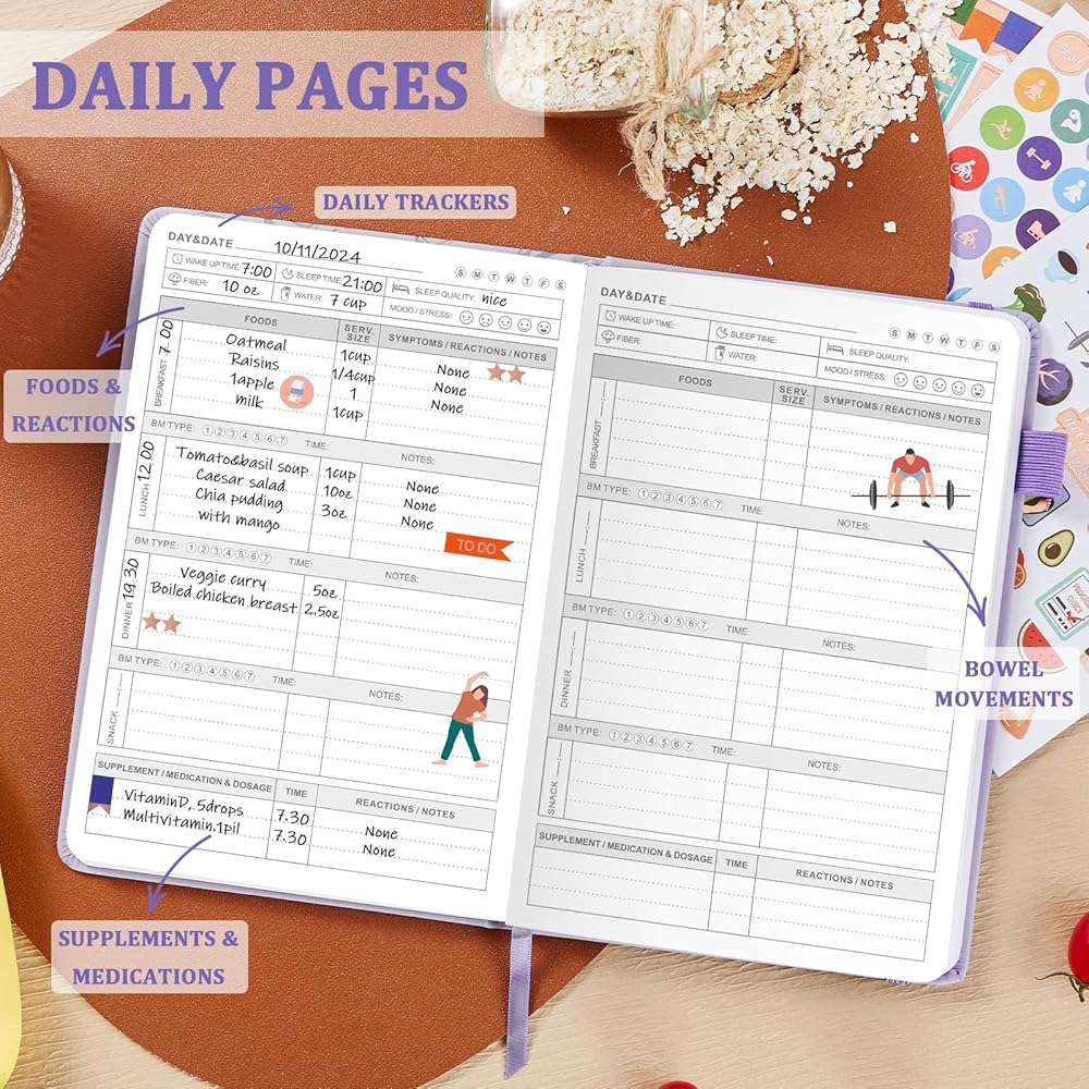 TRACK NUTRITION INTAKE: The JUBTIC Food Sensitivity Journal allows you to effortlessly log meals, snacks, bowel movements, fiber intake, water consumption, supplements, medications, sleep patterns, mood, and stress levels over 120 days. This meal planner notebook is designed to help you monitor your health journey effectively.
