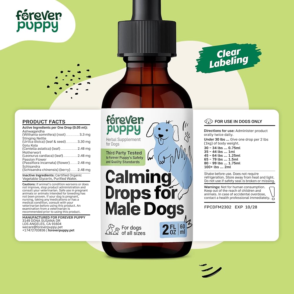 Happy Tails, Happy Days: Bring calmness to your male dog with our pet calming drops. Forever Puppy's ashwagandha & passionflower extract promotes peace during fireworks, loud noises, storms & travels.