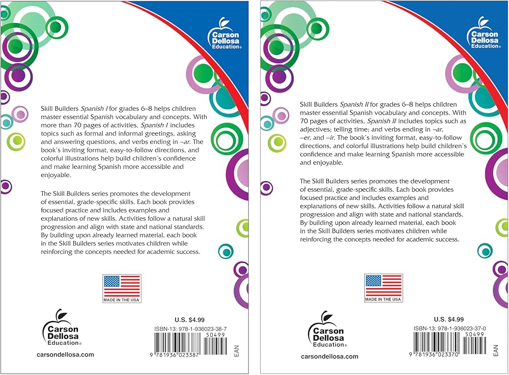 Support your child's Spanish learning journey with the Skill Builders Spanish Workbook Set for Grades 6-8! The set features 2 80-page Spanish workbooks for 6th grade, 7th grade, and 8th grade students, including a Level 1 and Level 2 Spanish Workbook, covering essential Spanish for kids such as common phrases, questions, vocabulary, parts of speech, and more. Each Spanish book is sized at about 6” x 9”—giving your child plenty of space to complete each exercise. Perfect for both classroom and homeschool curriculum, each workbook includes an answer key to track your child's progress. A review is included in the level 2 Spanish textbook.
