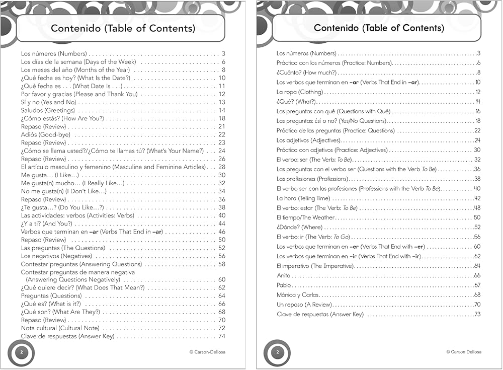 Helping your child along the way. An answer key is included in the back of each Spanish Workbook to track your child's progress. A review is included in the level 2 Spanish textbook.