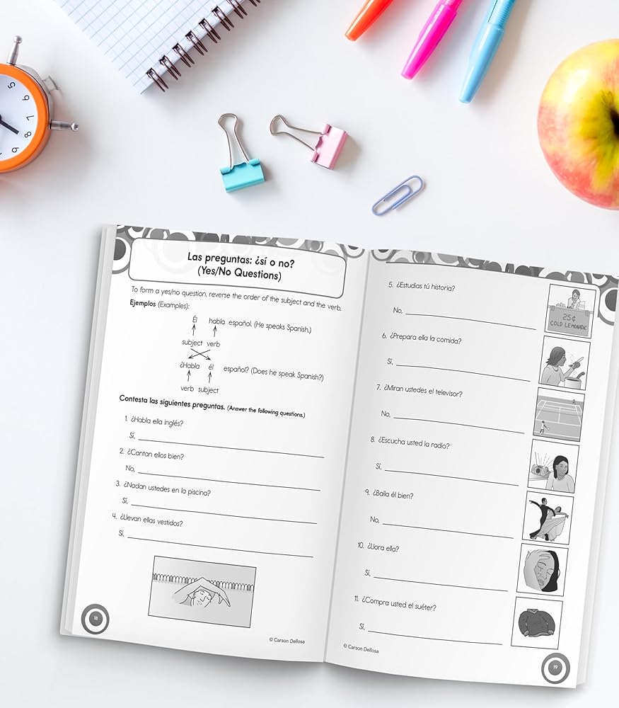 Engaging Spanish vocabulary builder for kids. Perfect for both classroom and homeschool curriculum, the activities in this workbook cover essential Spanish for kids including common phrases, questions, vocabulary, parts of speech, and more.