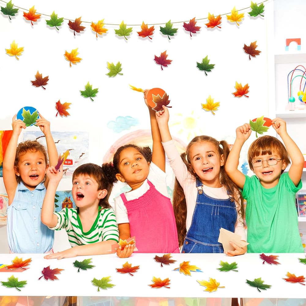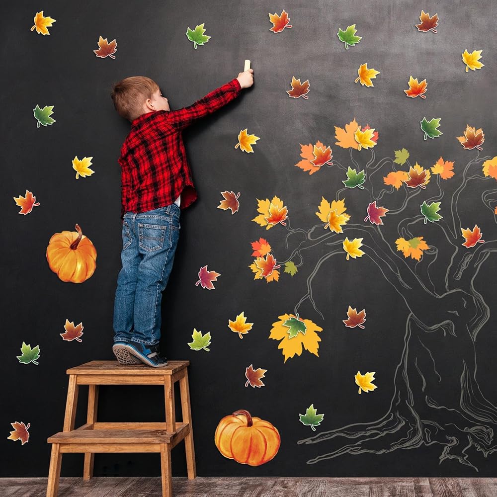The paper fall leaves are easy to install, you don't need to cut the shape when you get the cutout. Using the glue points we provided can easily stick the cutout on the walls, windows, doors, bulletin boards and so on.