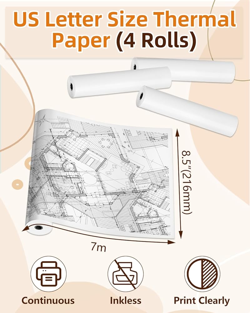 US Letter Size Thermal Paper: 8.5" x 11" (216 mm x 279 mm) black on white thermal printing paper, 4 rolls thermal paper, 7 m per roll