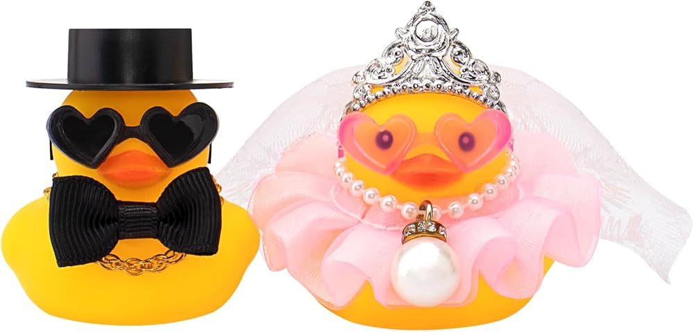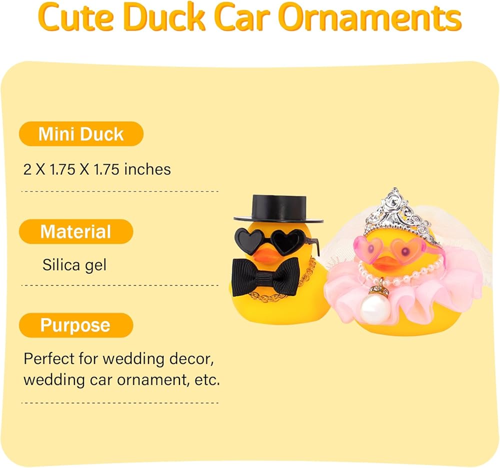 Package: One package includes 2 packs mini ducks including 2 mini rubber duck, 1 black genttleman hat, 1 crown or 1 crown with veil, 1 gold chain and 1 pearl necklace, 1 skirt and 1 black bow tie, 2 heart-shaped sunglasses(black&pink), and enough double-sided tapes.Use the tape to fix the hat on the duck's head.