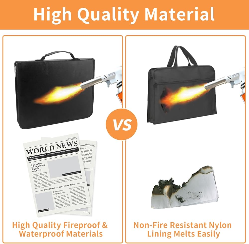 High Quality Material -- The fireproof accordion file organizer is made of a double layer of non-itchy, silicon-coated glass fiber that can withstand temperatures up to 2,000 degrees Fahrenheit. Has passed SGS test (UL94 VTM-0 certification). The fireproof document box is not only fireproof, but also waterproof, effectively protecting your important documents in wet weather.
