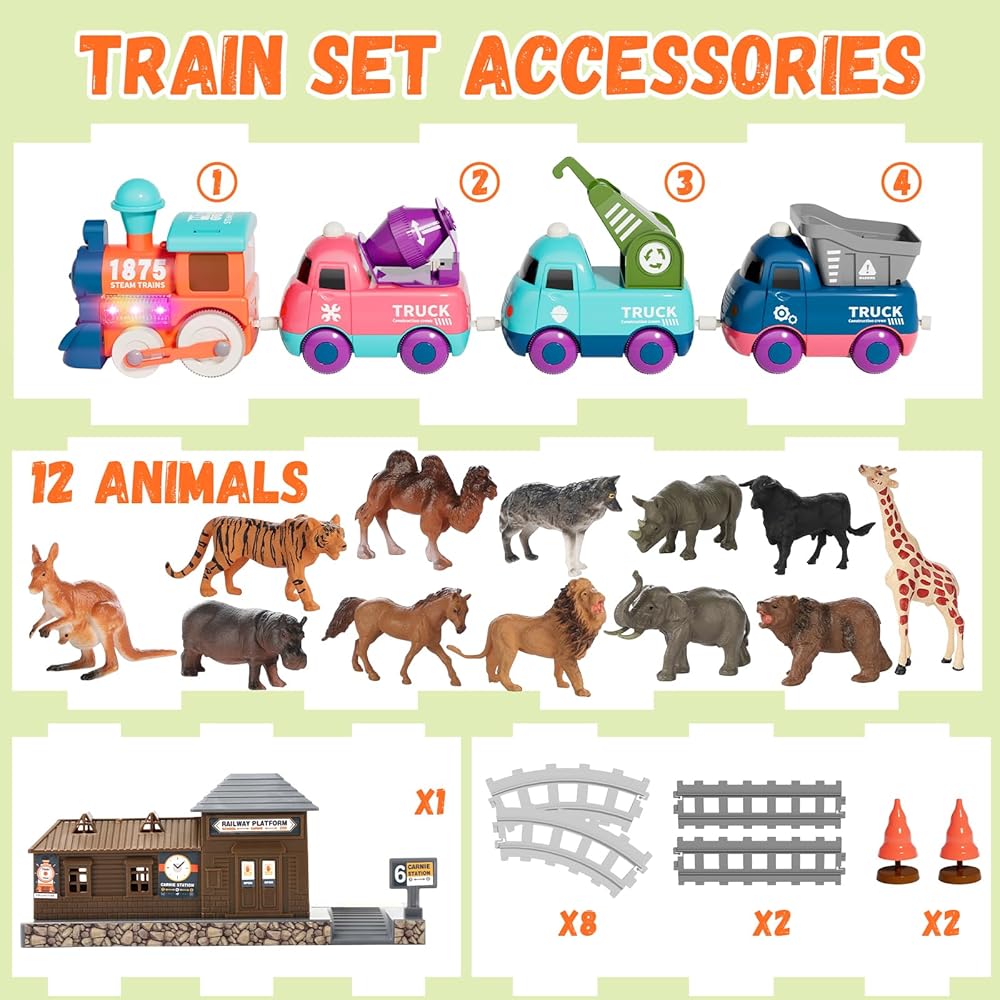 Just install the battery, press the switch and the train will move forward immediately with real and lively track sounds. These toddler train sets with animal world that captivates children's imagination. Designed for easy assembly, great for kids boys and girls aged 3 to 6, offering hours of joyful playtime