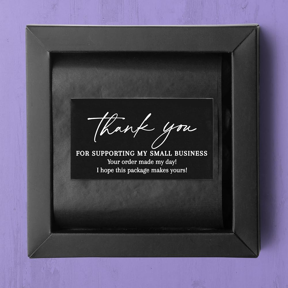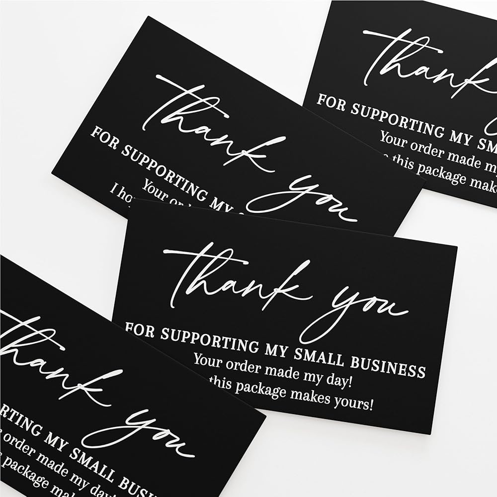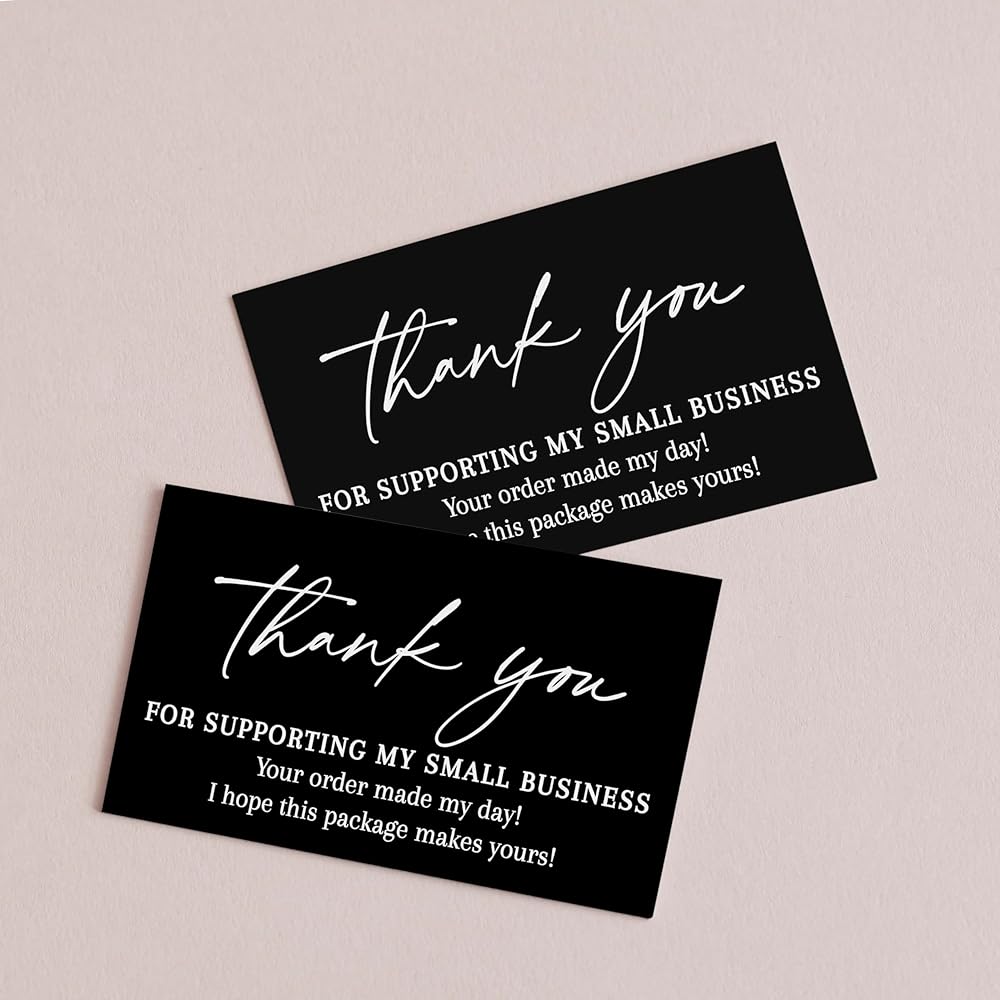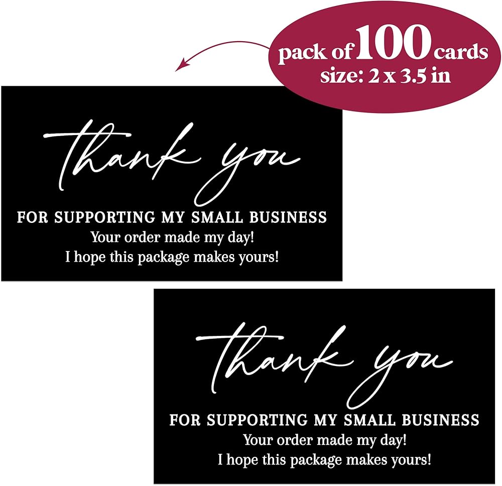 Quantity: Bulk pack of 100 Thank you Small business Cards in Black and White. Cards read: Thank you for supporting my small business. Your order made my day! I hope this package makes yours!