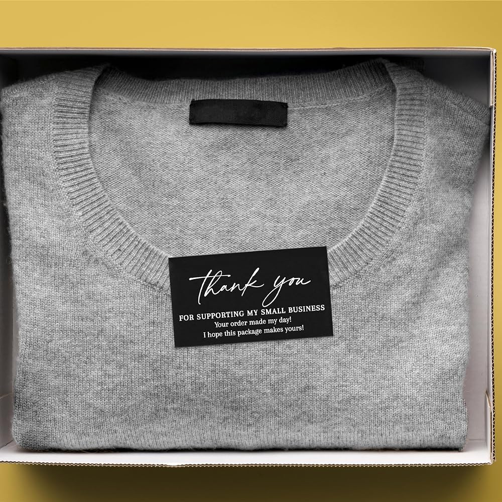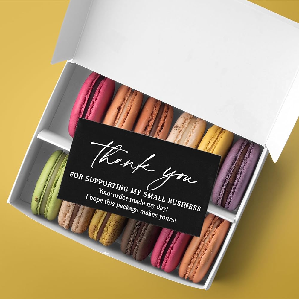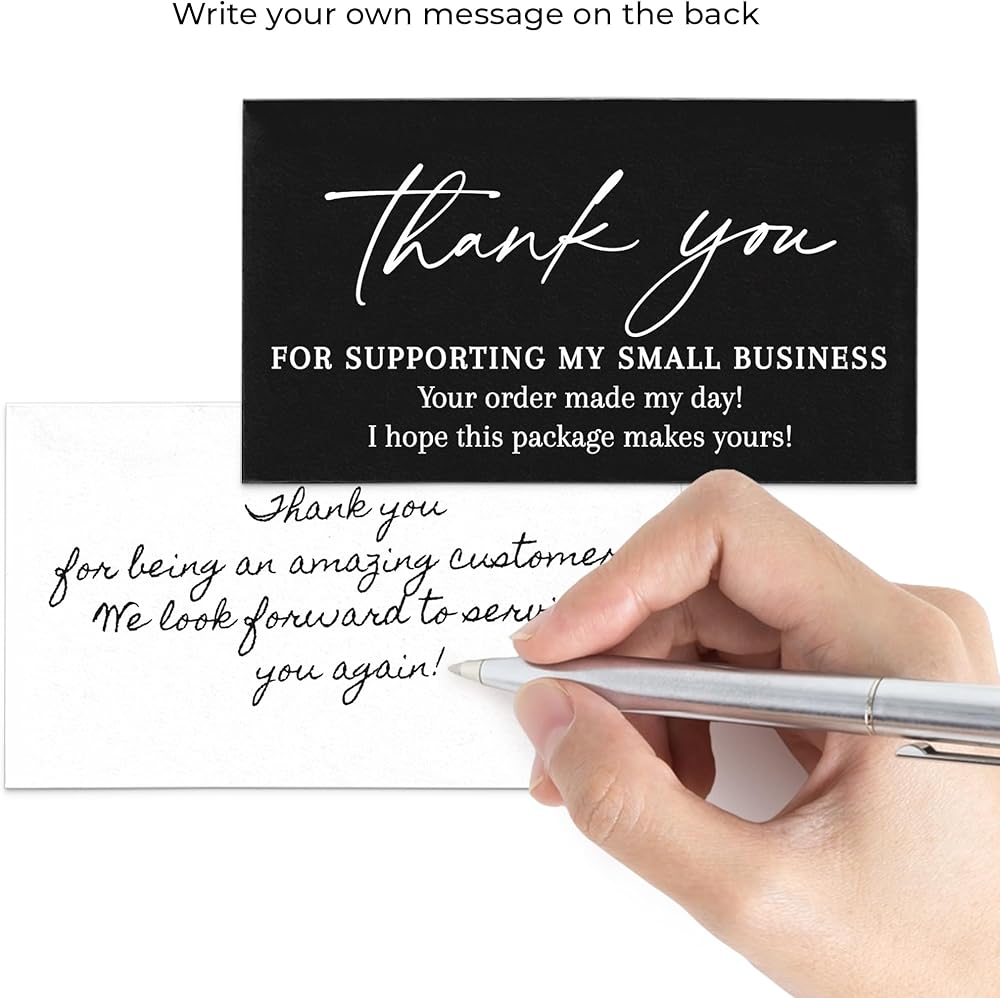 Quantity: Bulk pack of 100 Thank you Small business Cards in Black and White. Cards read: Thank you for supporting my small business. Your order made my day! I hope this package makes yours!