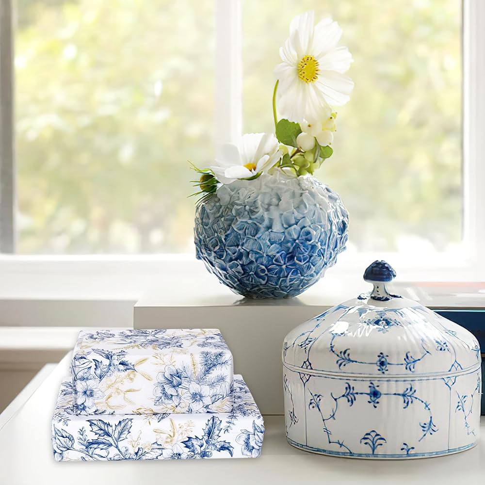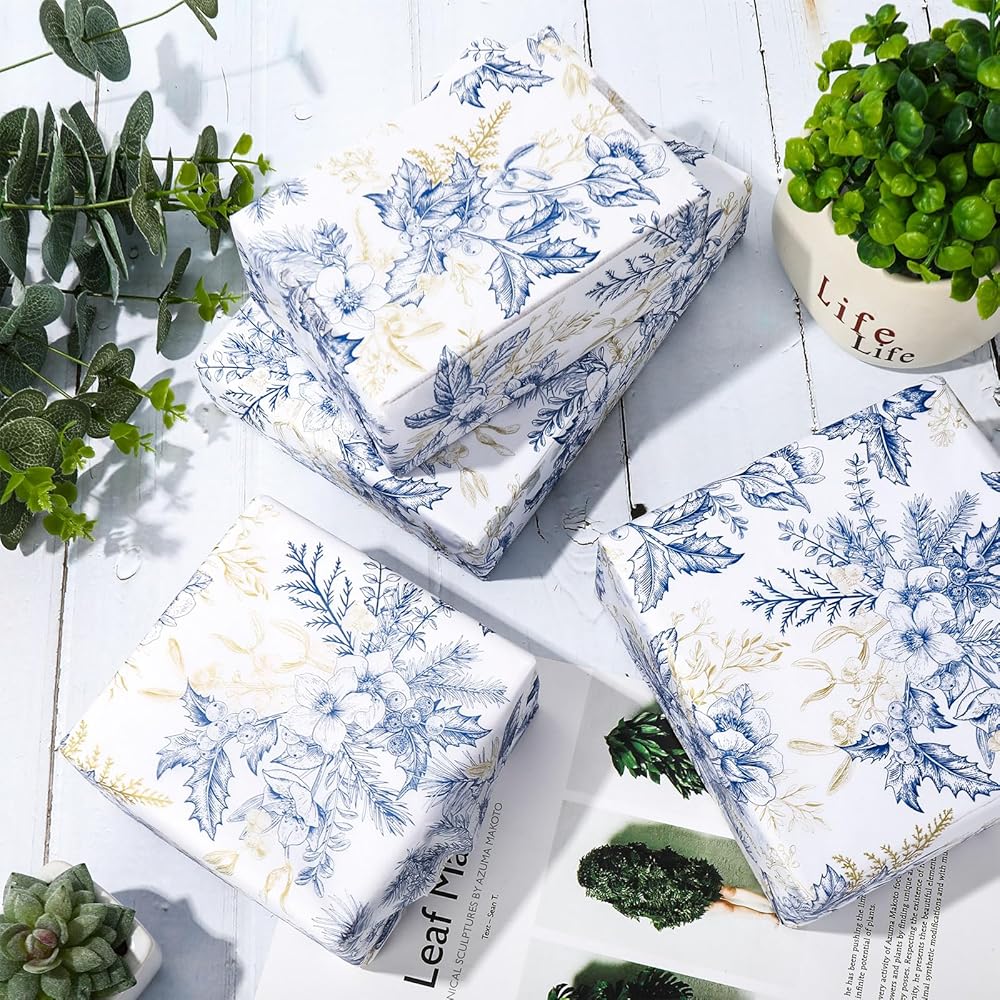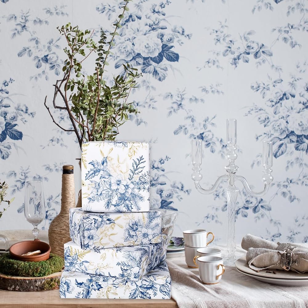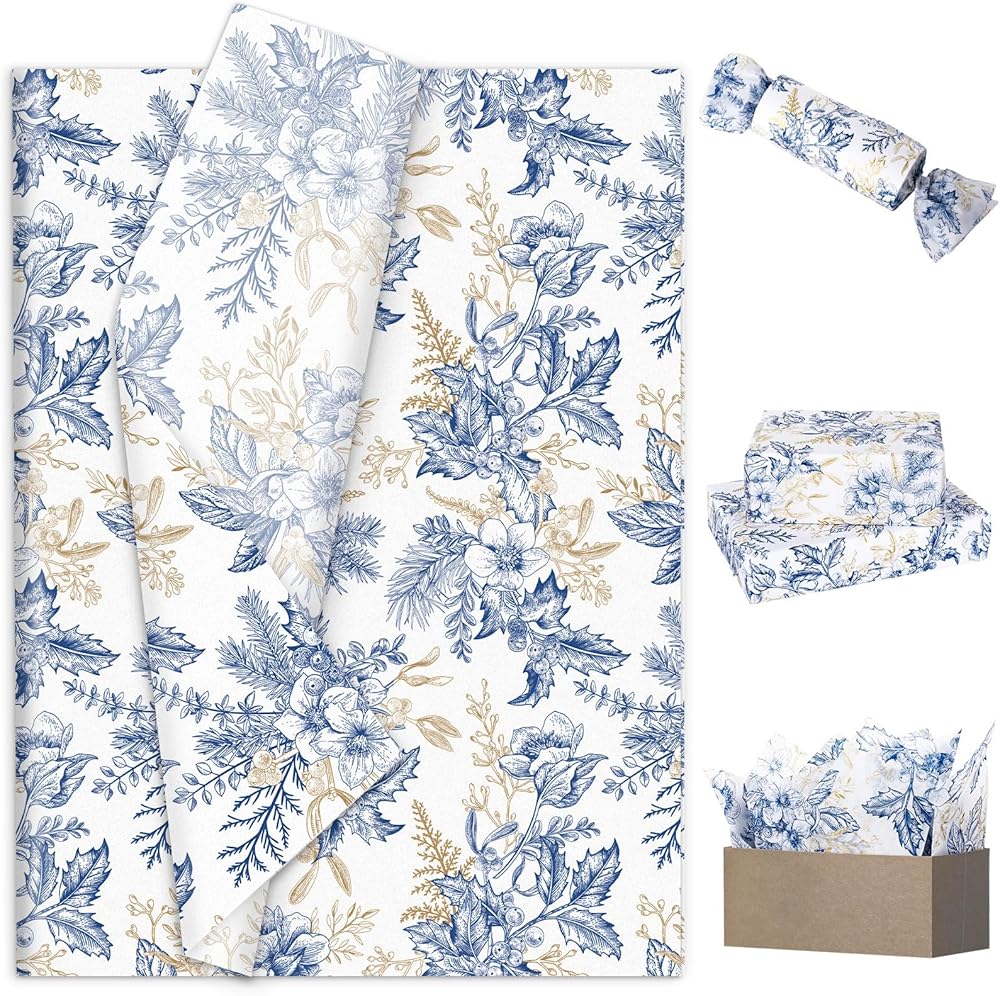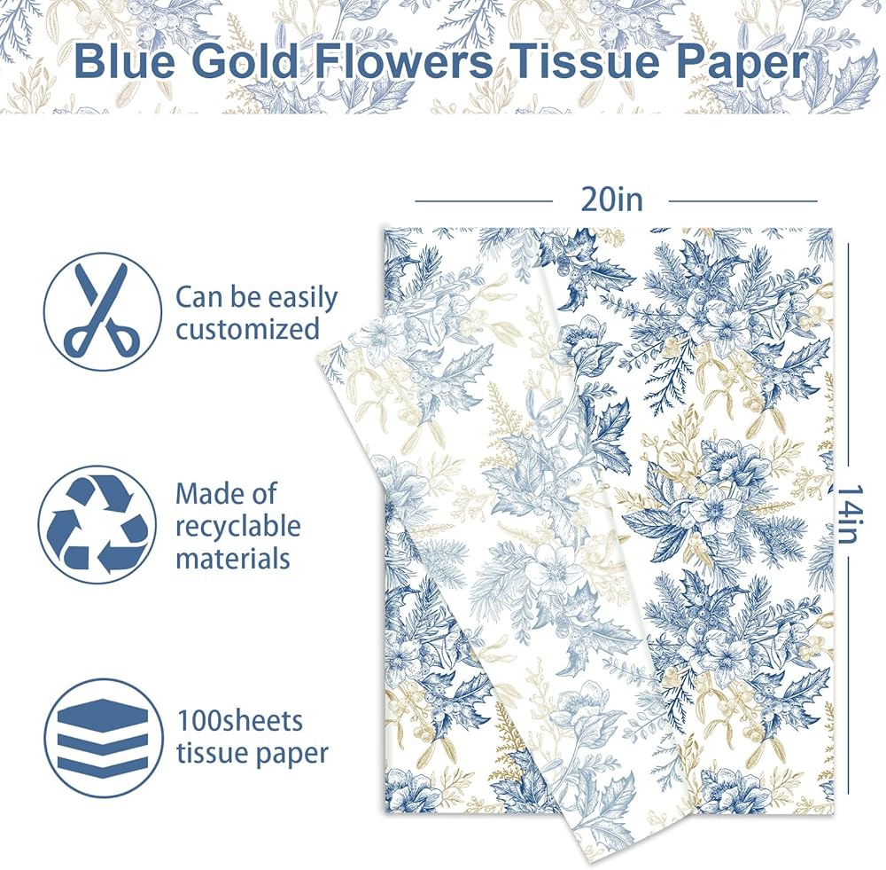 JarThenaAMCS 100 Sheet Floral Tissue Paper Blue Gold Flower Berry Wrapping Paper Vintage Art Tissue for Wedding Birthday Baby Bridal Shower DIY Crafts Gift Packing