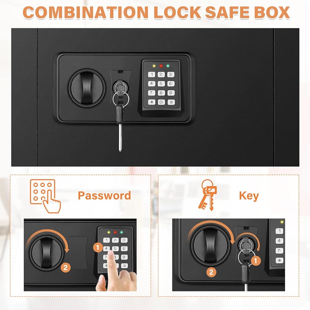 Combination Lock: You can set a 3-8 digit password for the safe and use two ways to open the door. ①password+ knob. ②Emergency key+ knob.The first time you get the safe, please use the key to open the door