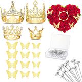 Comprehensive Flower Bouquet Accessories Including 4 Pieces Gold Crowns (varying in styles and sizes across sets)for Flower Bouquets, 12 Pieces Butterfly Decorations and 50 Pieces Diamond Pins for Bouquets. Customize your flower arrangements with endless possibilities, ensuring a unique and elegant touch for every occasion.