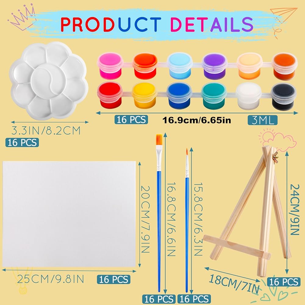 16 Set Canvas Panels and Easel Painting Kit,8 x 10 in Painting Canvases with Easel,16 Acrylic Paint Strips with 32 Brushes,16 Palettes,Art Painting Kits for Birthday Party Favors