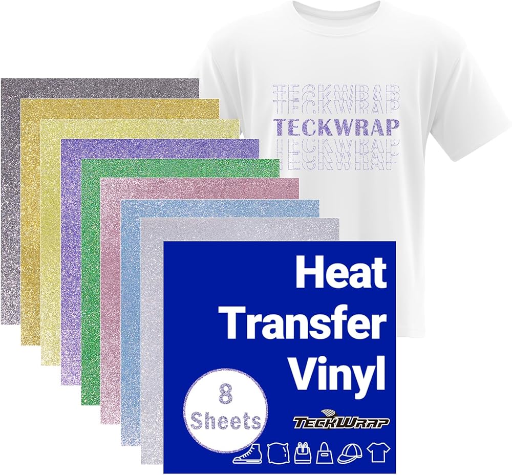 TECKWRAP Glitter Heat Transfer Vinyl Sheets, 8 Sheets 12"x10" Soft Shimmer HTV Vinyl for T-Shirts, Clothes, Bags, and More, Glitter HTV Sheets Iron on Vinyl for Most Cutter Machine, Easy to Use