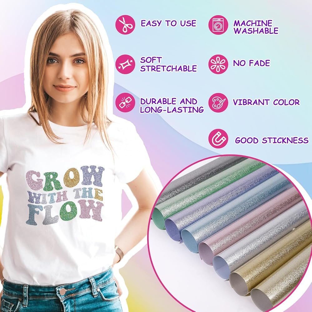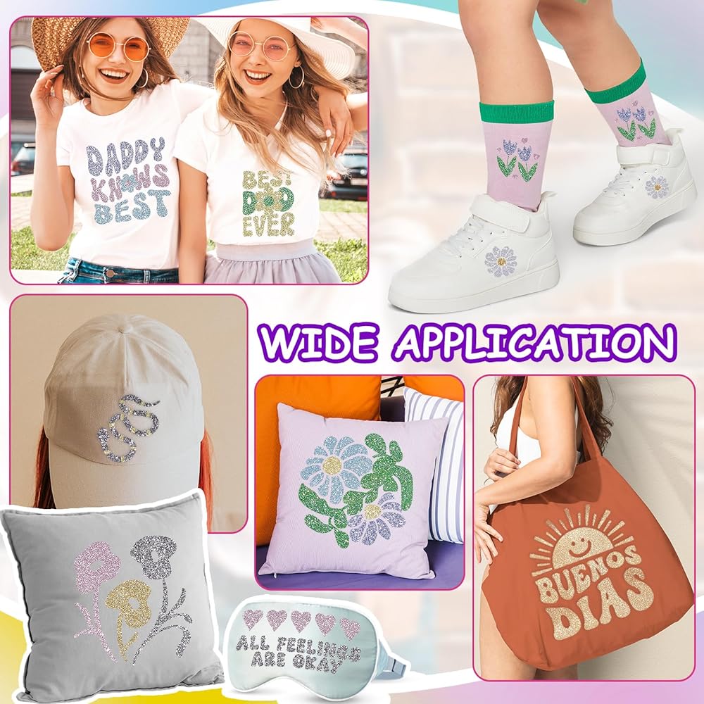 VERSATILE APPLICATIONS, WIDELY SUITABLE: This set is suitable for various textiles, such as T-shirts, hats, canvas bags, and home decor items. Whether creating personalized gifts or adding unique embellishments to clothing, the glitter heat transfer vinyl can easily bring your projects to life, adding creativity and style to meet the needs of different scenarios.