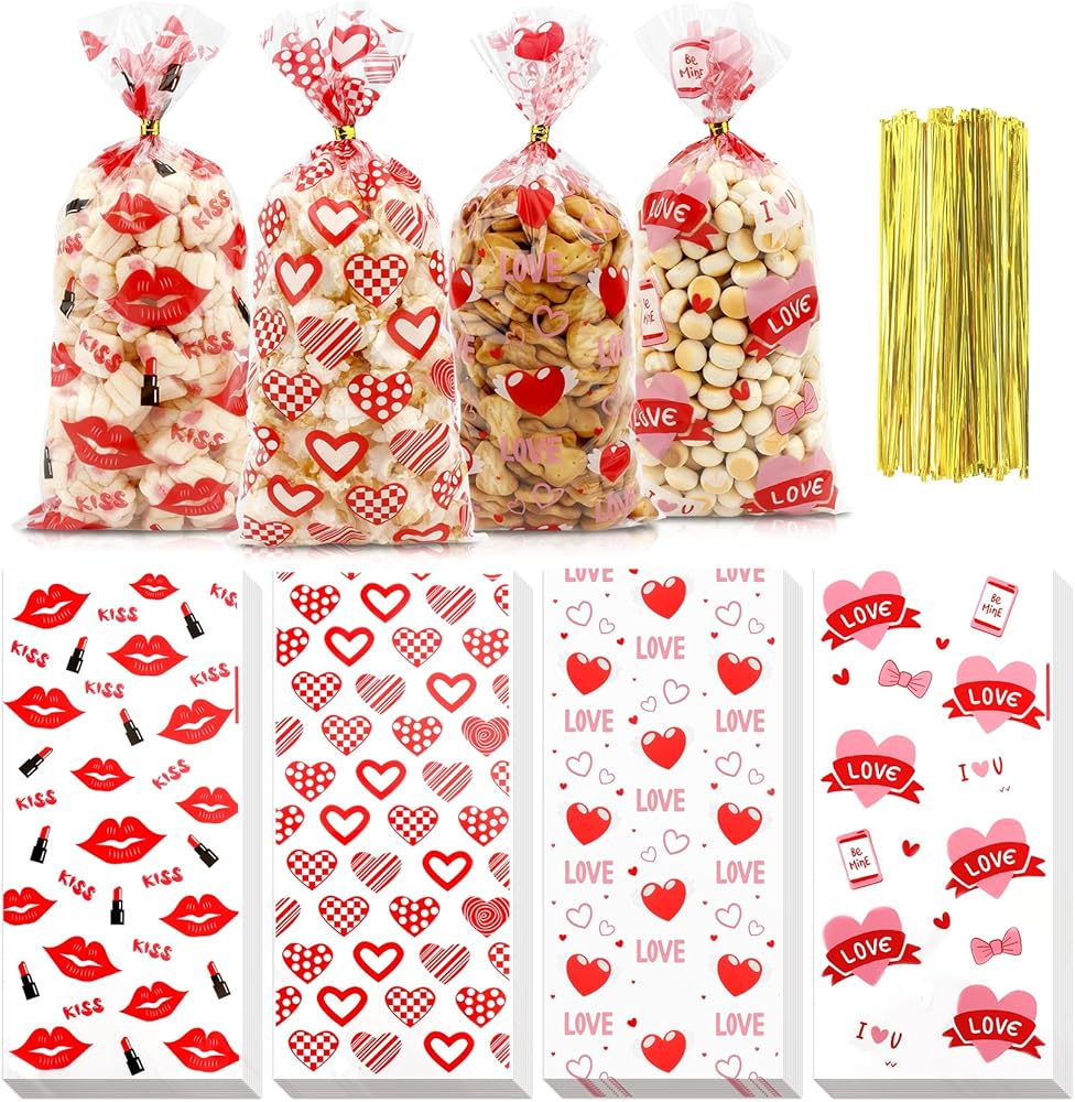 Premium Material: Our Valentines gift bags are made of high quality food-grade plastic which are sturdy, smooth surface, non-toxic, tasteless and lightweight. Gold twist ties are easy to twist and good tightness to prevent the contents from leaking out. Valentine's day treat bags are suitable to put some goods such as popcorns, cookies, candy, snacks, chocolates, cupcakes, bicuits, nuts, small gifts and so on, can also as a perfect gift for your kids, family and friends