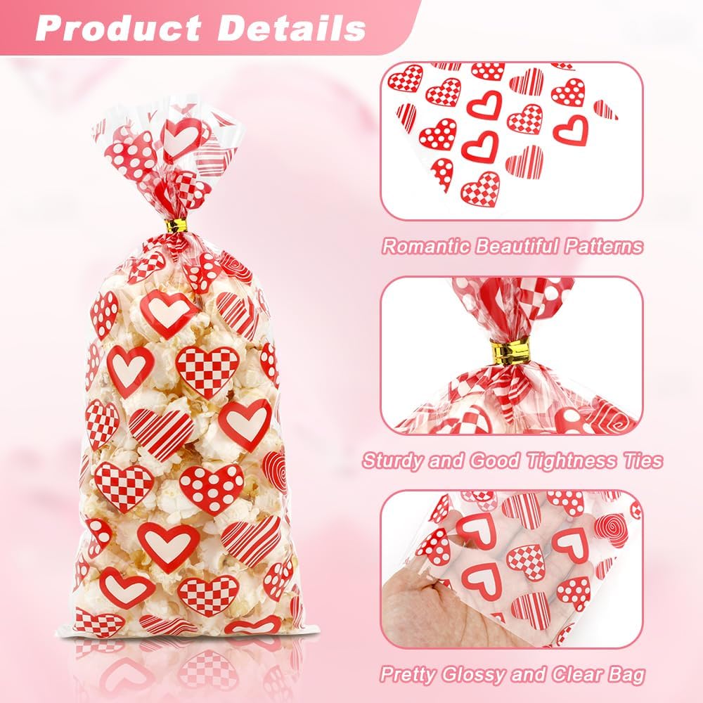 Proper size: Our Valentine cellophane treat bags measure about 10.6" x 4.9"/27cmx12.5cm, the size of the twist tie is 3.5"/9cm which have enough capicity and easy to carry, are convenient to Valentine's Day snack wrapping, can bundle a gift bag easily and store items better. These cellophane goodie bag are suitable for Valentines party decorations, Valentines party supplies or other love theme parties
