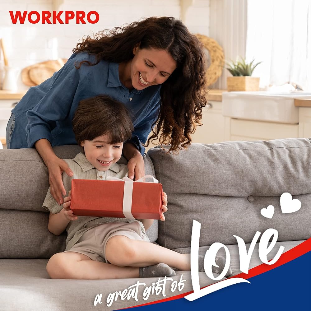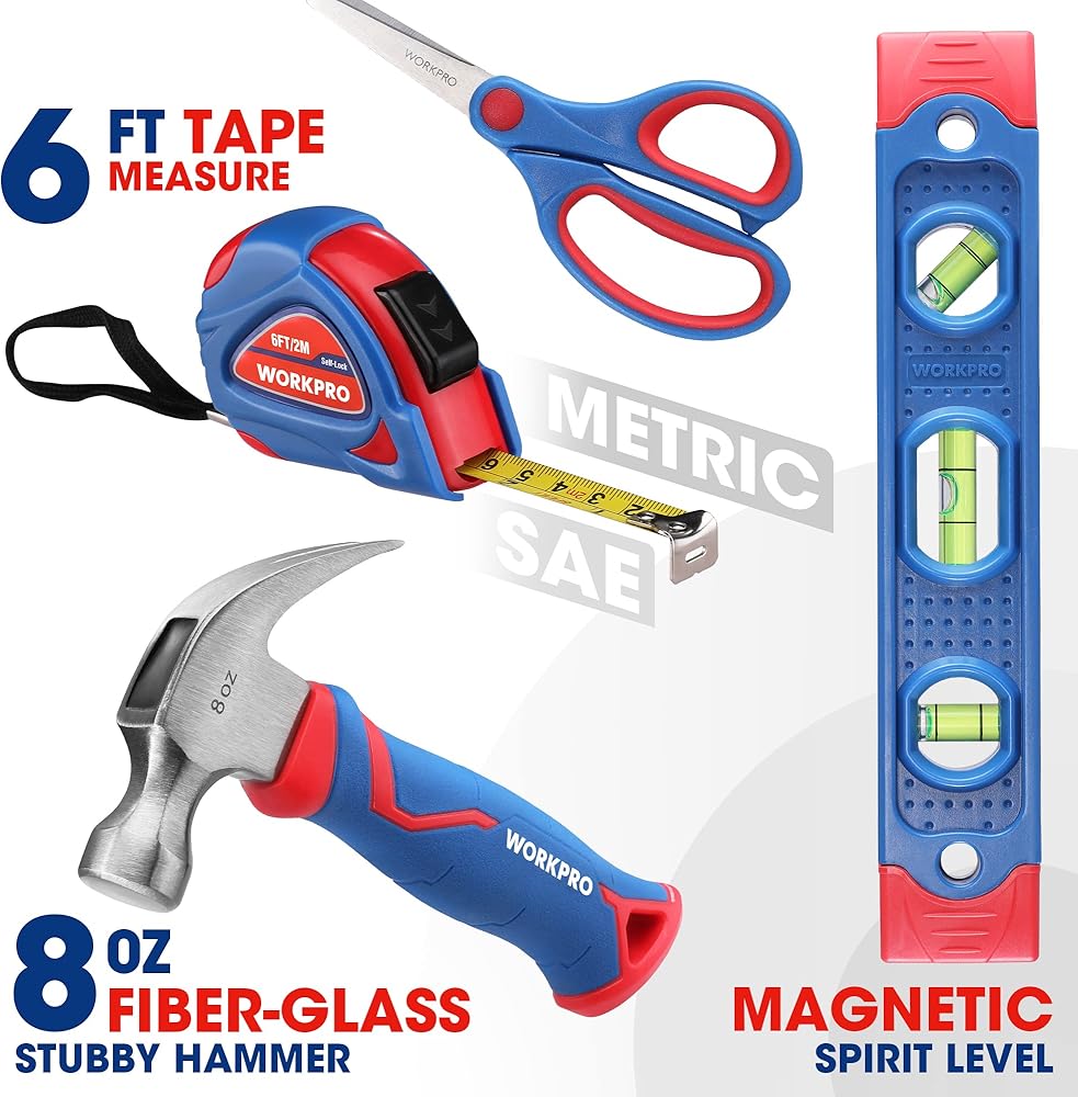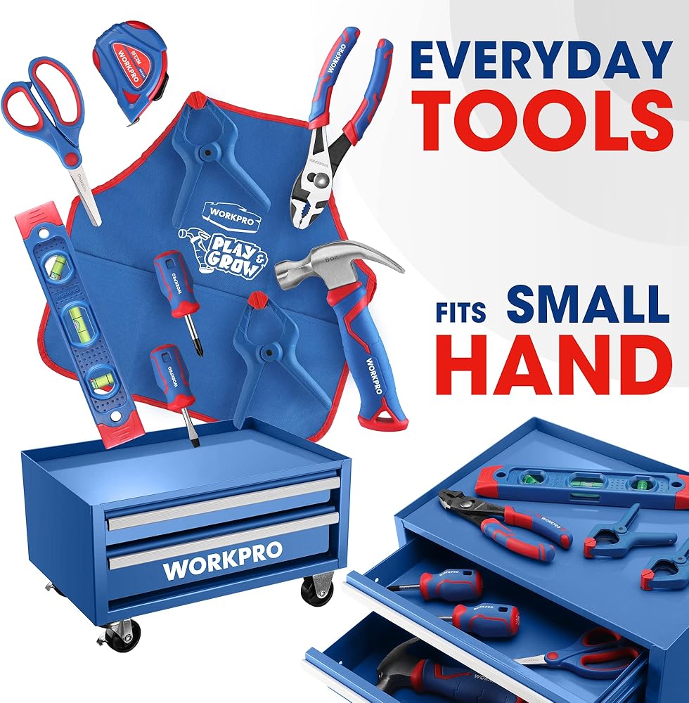 WORKPRO Kids Real Tool Set with 12 Inch Steel Tool Chest with Wheels, 10PCS Boys First Tool Set with 2 Drawers Blue Metal Rolling Tool Chest, Kids Woodworking Tools for DIY, Home Repair