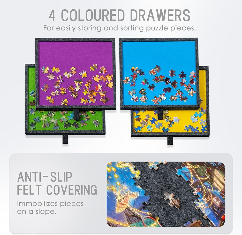 4 Colored Drawers - Designed with 4 colored drawers to sort out puzzle pieces as well as to preserve your unfinished puzzle game. Each drawer is designed with a handle for easy pulling out. Also stay closed when not in use and leave you no worry about missing pieces.