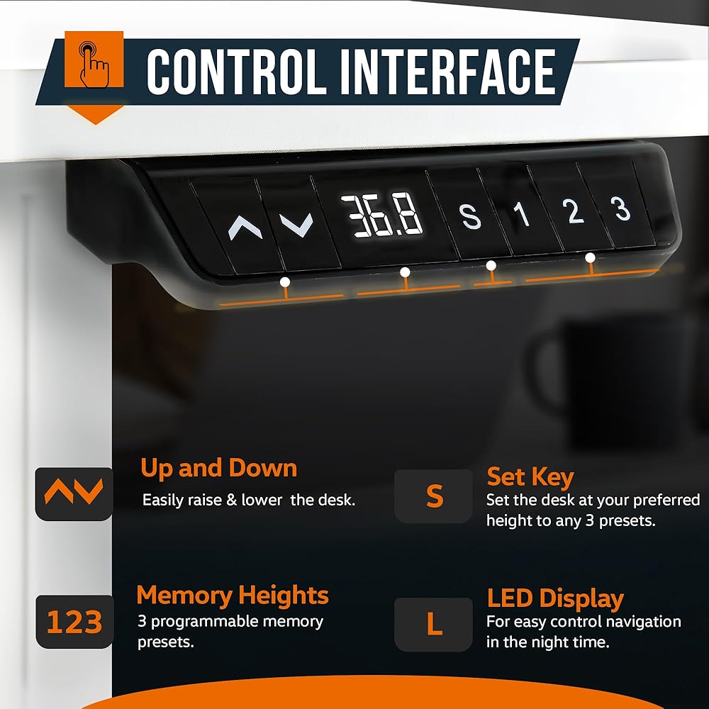 HEIGHT ADJUSTABLE – Ranging from 29.3“ to 48.6” (2.4 - 4.0 ft) including feet and support pad. Desk control panel includes 3 Memory settings to set your desired height with a single touch of a button.