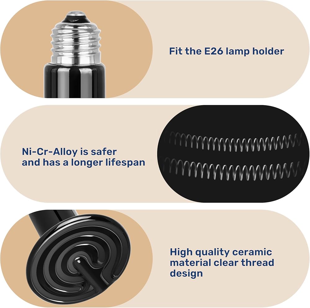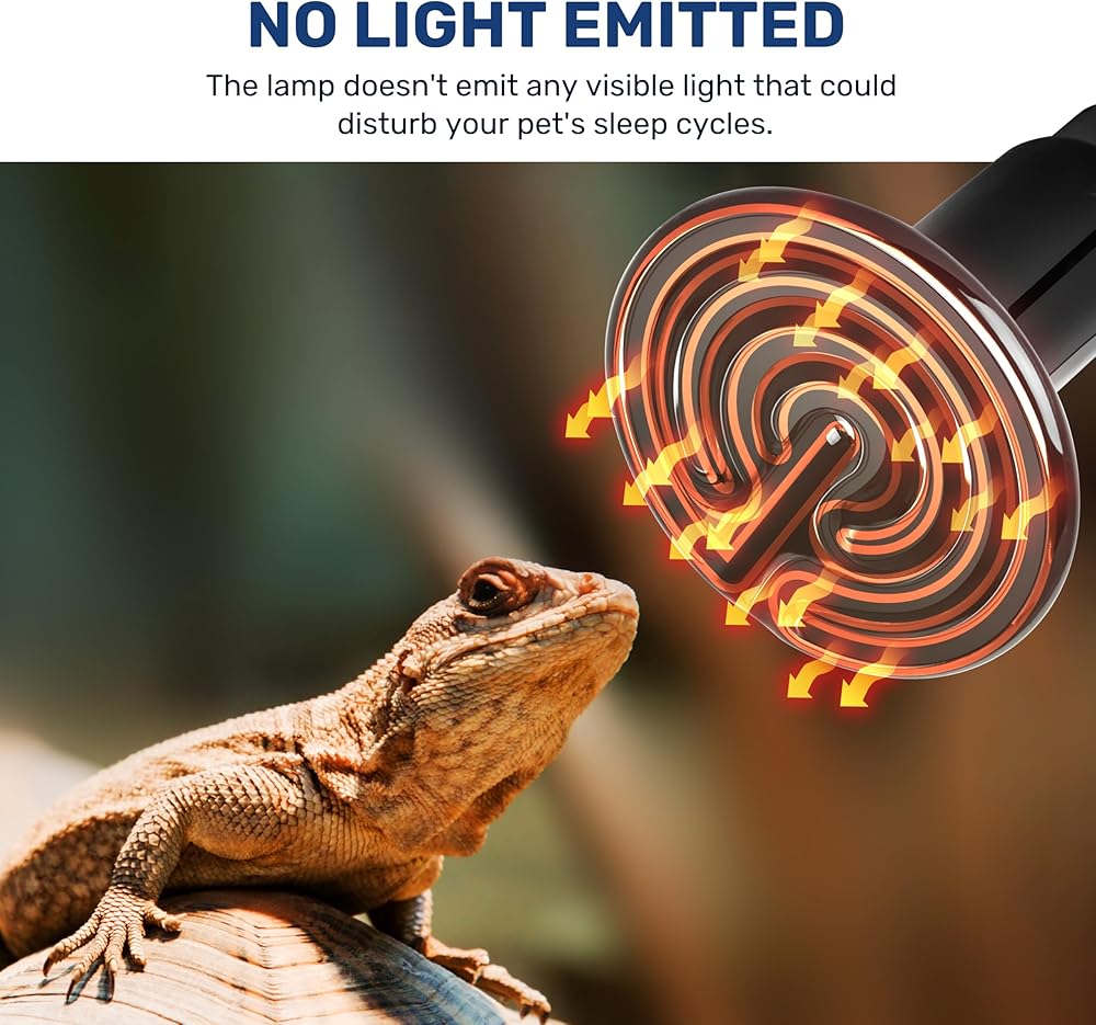 No Light Emitting: The heating bulbs only generates heat and don't emit visually light, which won't disturb your pet's sleep cycle. Specifications: 150W; 110-120V; use in standard E26 lamp base; 75mm diameter, 100mm length