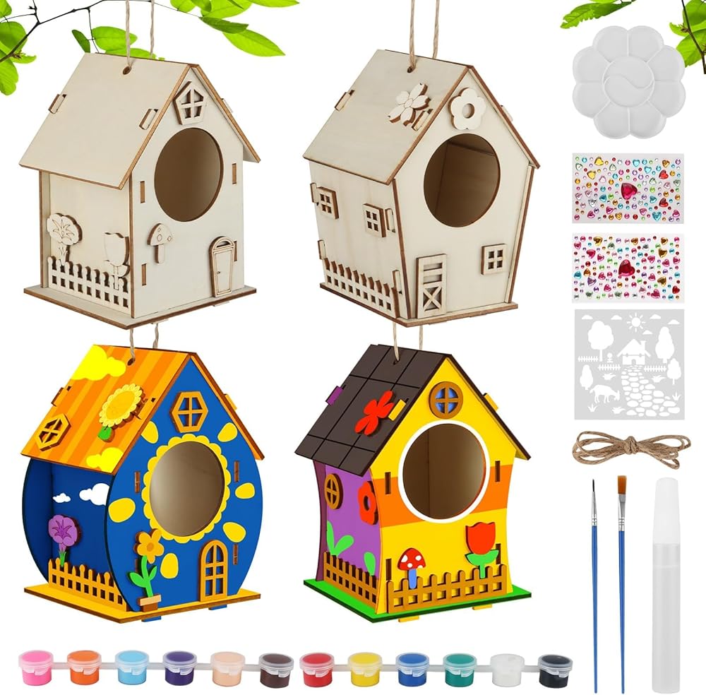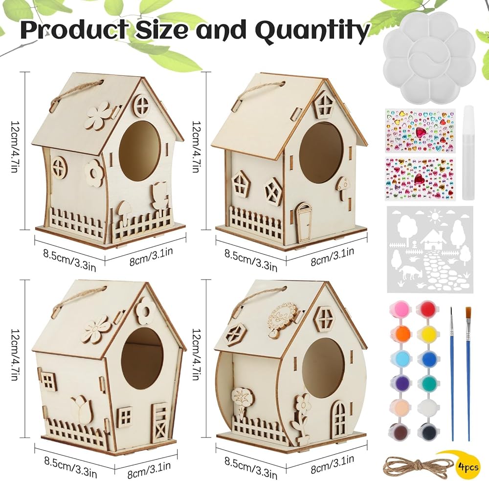 Fulietaobai 4 Pieces Birdhouse Kit for Kids, Paint Your Own Birdhouse, DIY Wooden Birdhouse for Painting, Birdhouse Wood with Color Form, Craft Kit Children for Girls Boys Toddlers