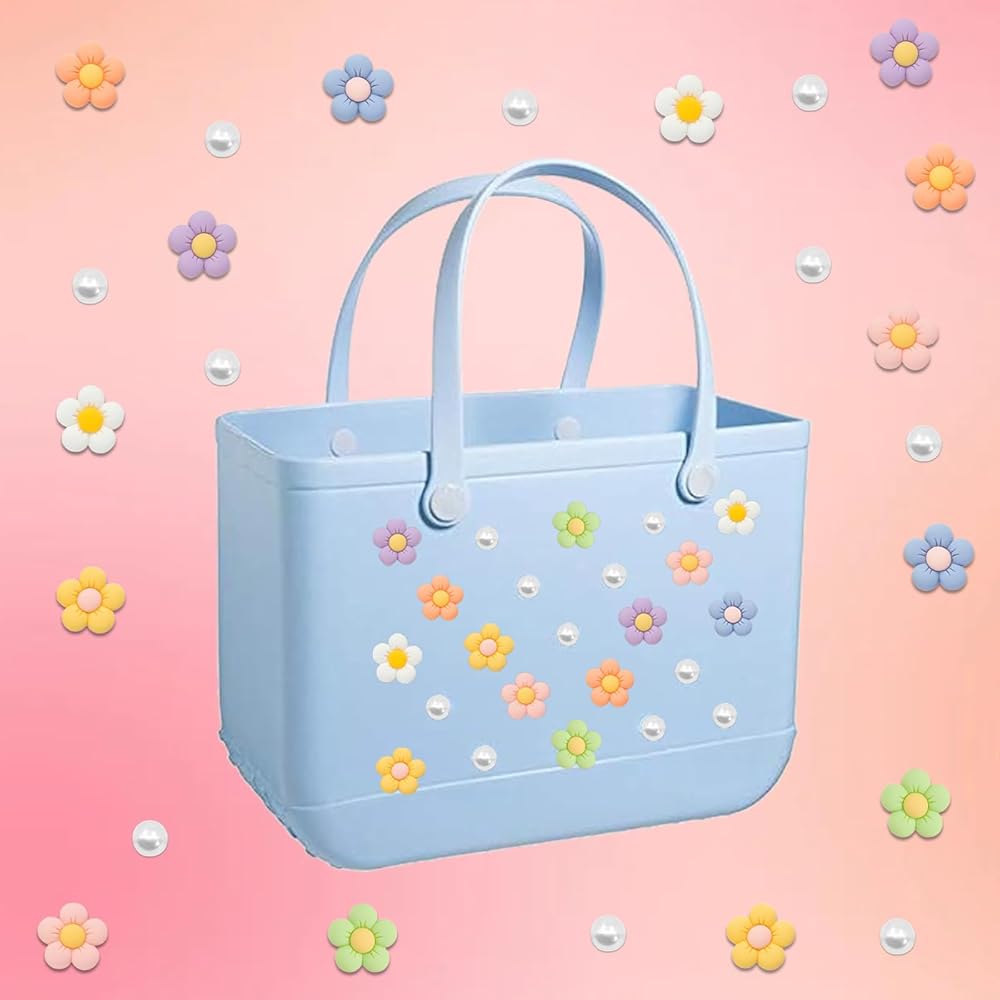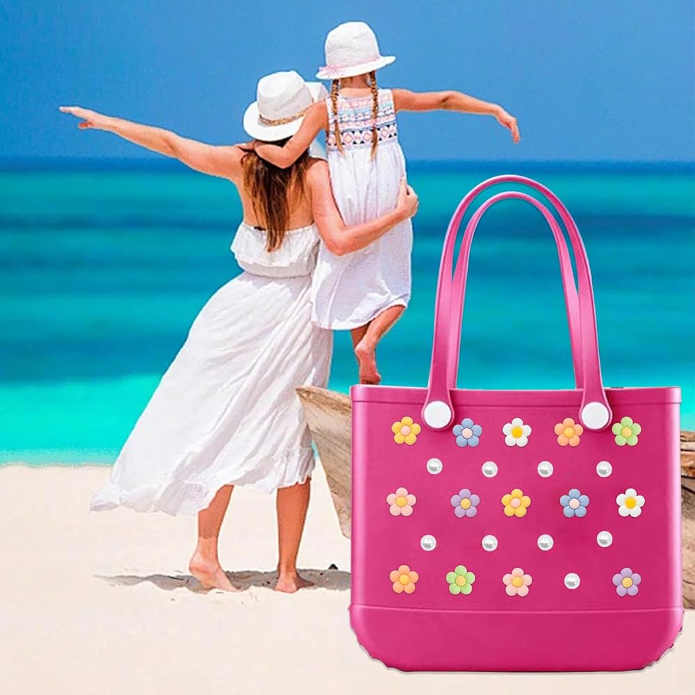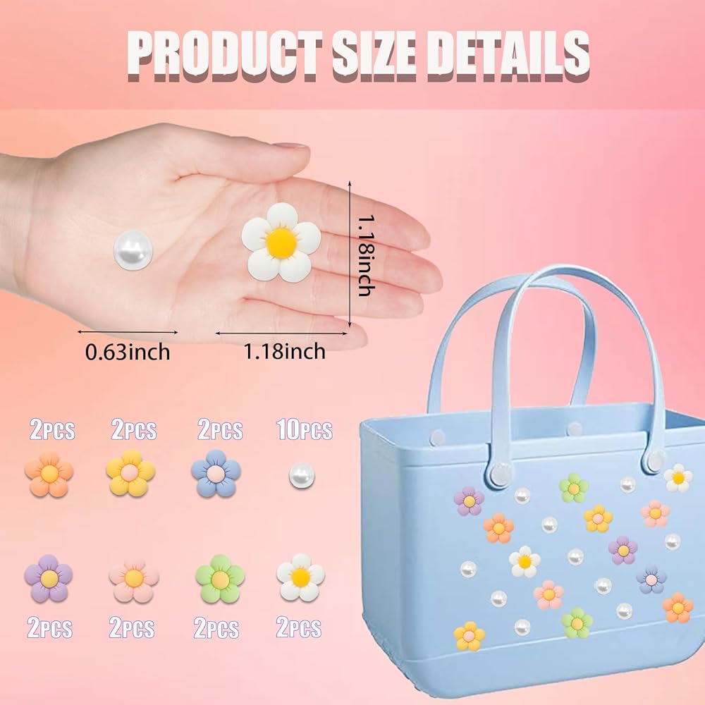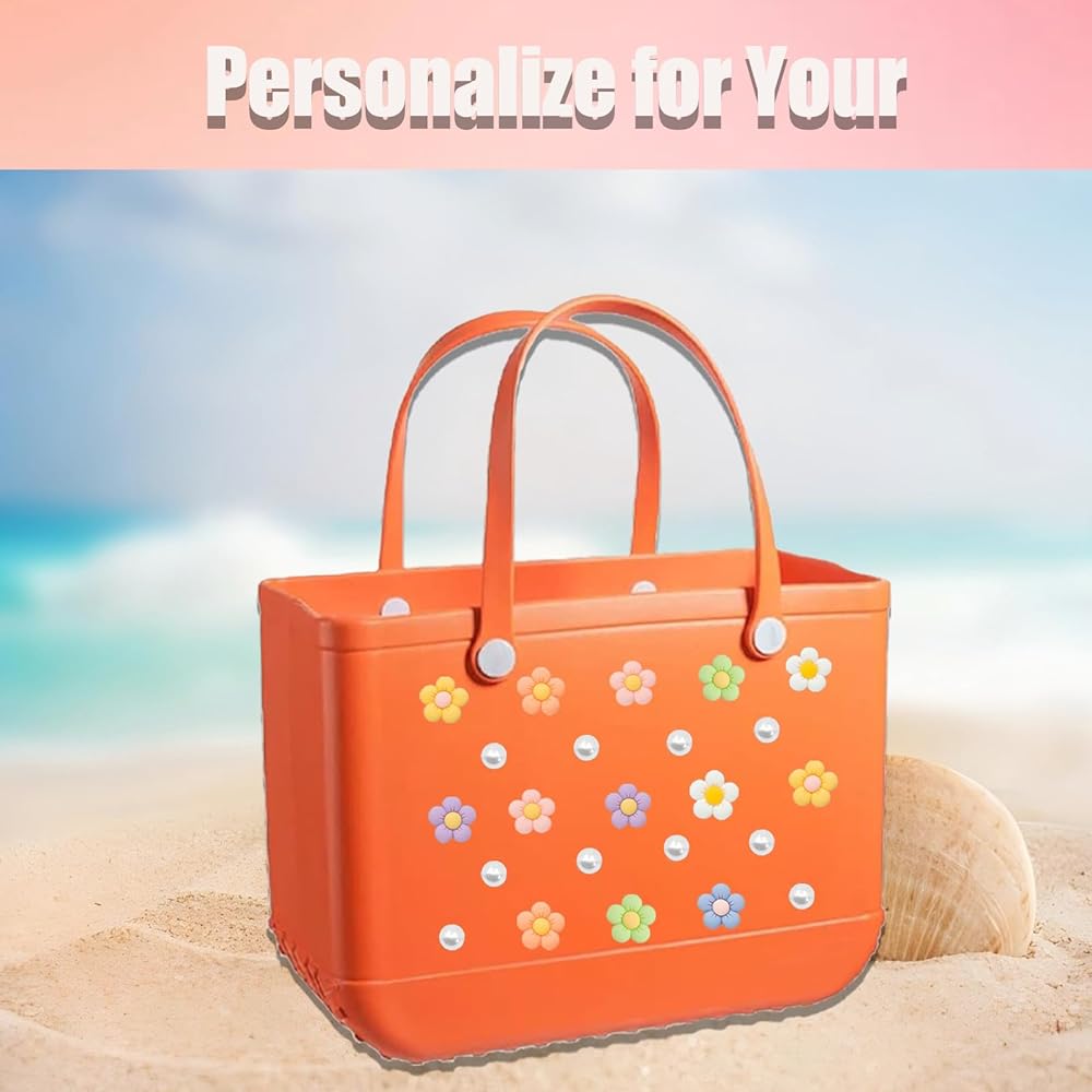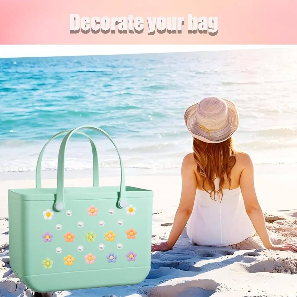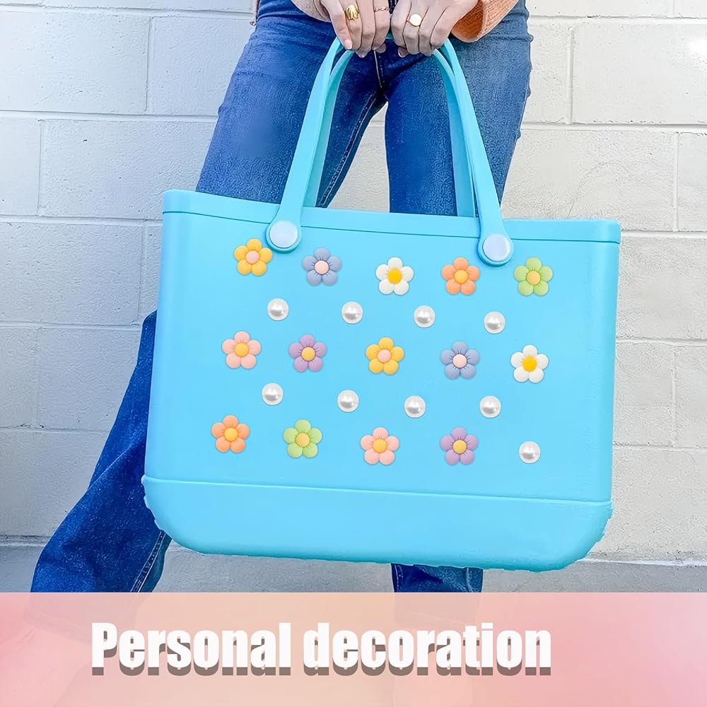 Compatible with Bog Bag Accessories Charms: This set includes 14 flower charms in 7 different colors, and 10 pearl charms, all essential components for adding a distinctive touch to your beach bag