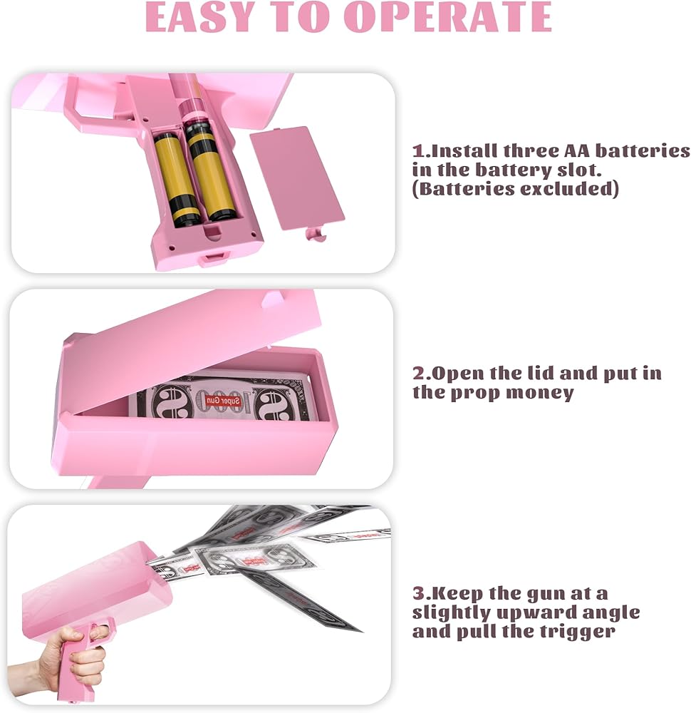 Easy to Use - Just install 3 AA batteries into the gun right side, and gently pull the trigger, you can make a funny rain charmingly. With the fashion money gun in hand, you will impress your friends and families.