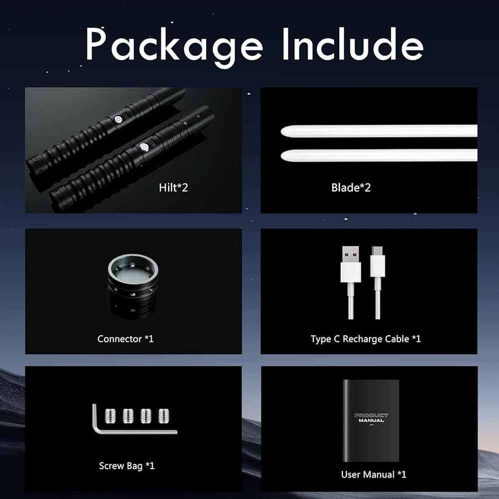 Aluminum Hilt + Sturdy PC Blade - The hilt of the light saber is made of solid aluminum alloy, sleek desgin and easy to assemble and detach. Nice polished, not too light nor too weight, with a great balance on your hands. 2 durable 36'' full size PC blade are perfect for heavy dueling, with vivid realistic colors.