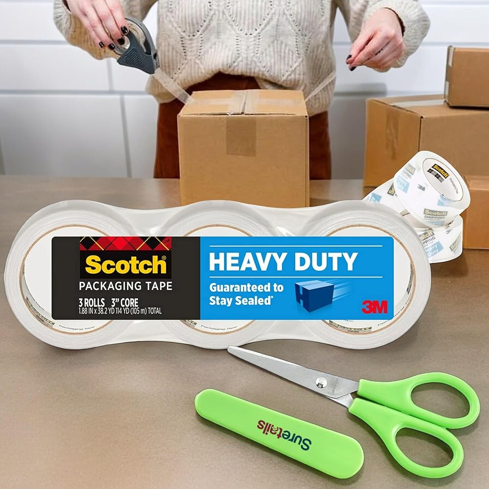 Heavy Duty Packaging Tape, 1.88" x 38.2 yd (3-Count) Clear Bundle with Paper Scissor, Designed for Packing, Shipping and Mailing(3850S-3) [Pack of 3]