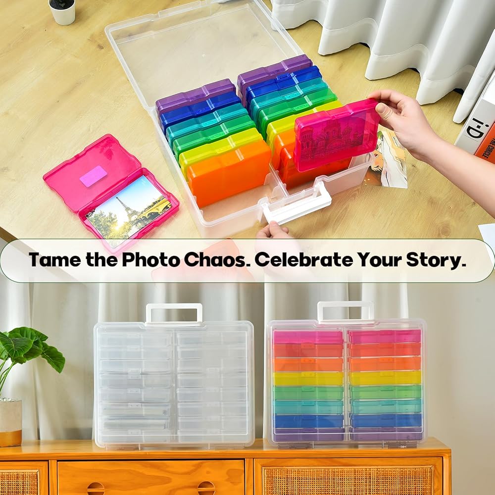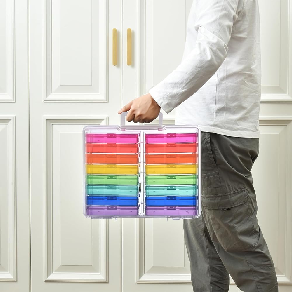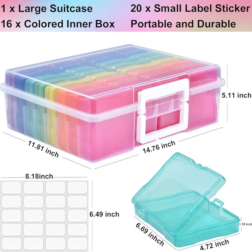 Photo Storage Box with Handle, 4" x 6" Photo Organizer Storage Container with 16 Inner Case and 1 Sheet Blank Labels for Pictures, Arts, Crafts, Sewing, Seeds, Office Supplies