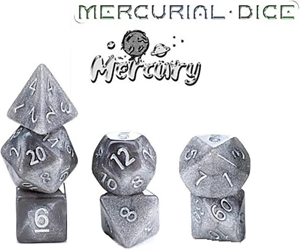 MERCURIAL DICE: BLACK HOLE - Mercurial Dice are premium resin dice with a unique arrangement of holographic style glitters in opaque dice! "It can't be done," they said. Well, we did it! And they're stunning like the rays of the sun being sucked into a black hole! This set, named after black holes, are a color that can only be called: Non-Space. Roll em, and enjoy the stunning beauty of the sparkle in the solar system's most simple and beautiful resin dice: Mercurial Dice! Each die has the high and low numbers centered on the color halves for high-speed number recognition. Made of high-impact resin, with the a similar casting process we use for our other dice that prevents air-bubbles from forming inside, Gate Keeper Games dice bear the honor of being the heaviest, densest, and most well-balanced resin dice on the planet, and have 3rd party roll testing to prove it! INCLUDES: One d20, One d12, Two d10 (00-90 and 0-9), One d8, One d6, One d4, One Dice Castle Tower.