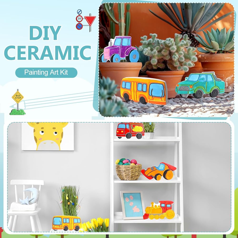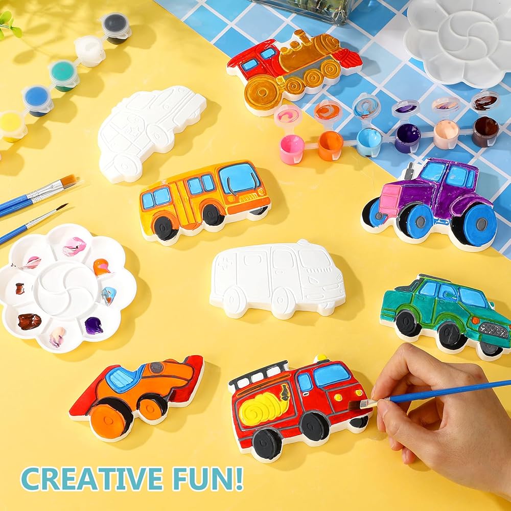 HyDren 8 Pack Paint Your Own Plaster Stones Spring DIY Outdoor Garden Arts and Crafts DIY Stones Painting Kit Supplies with Paint Palette and Brush for Easter Birthday Gifts(Car)